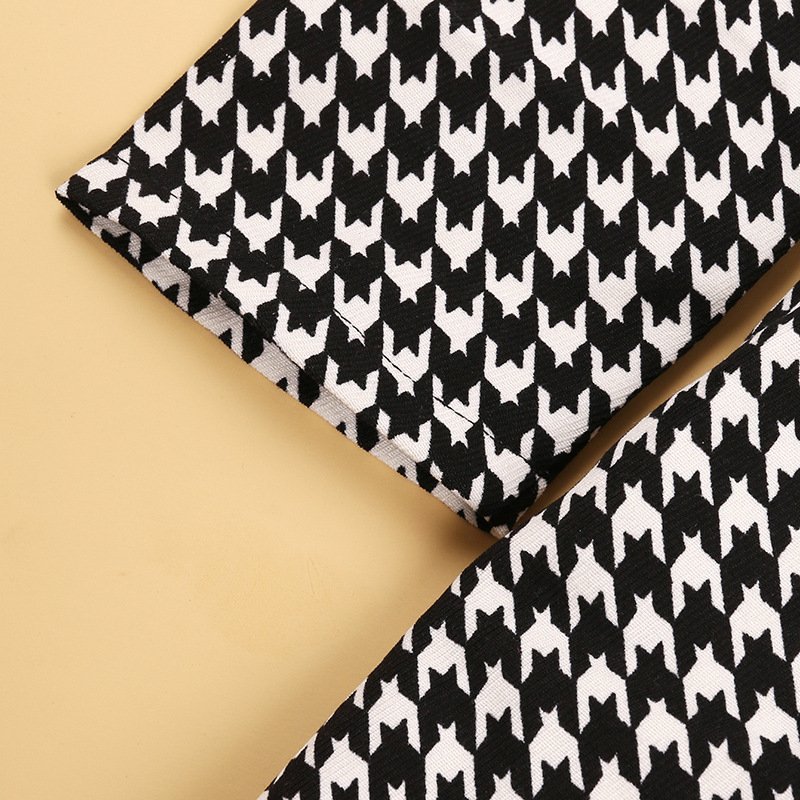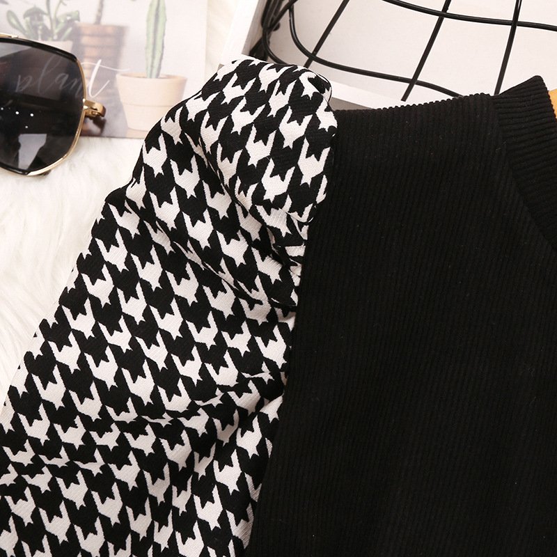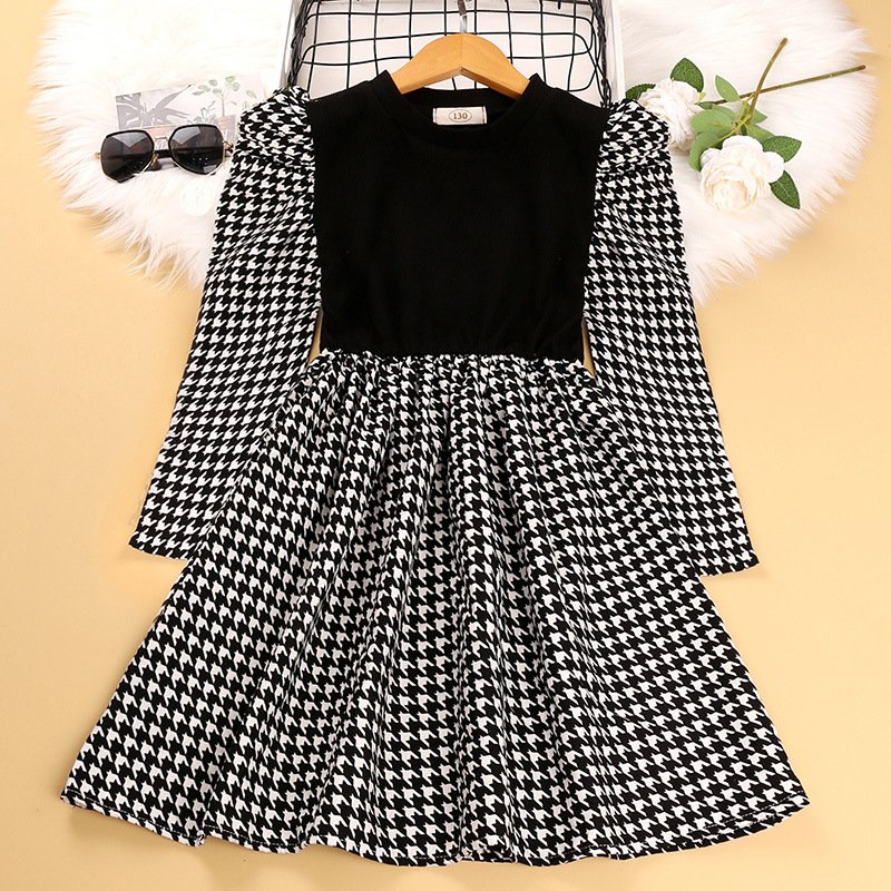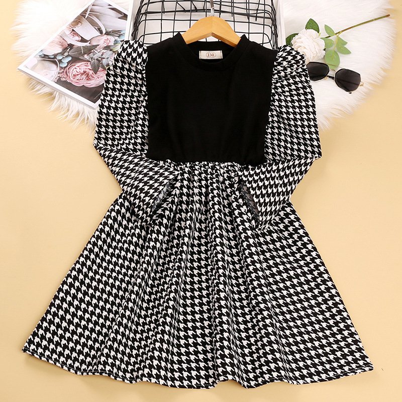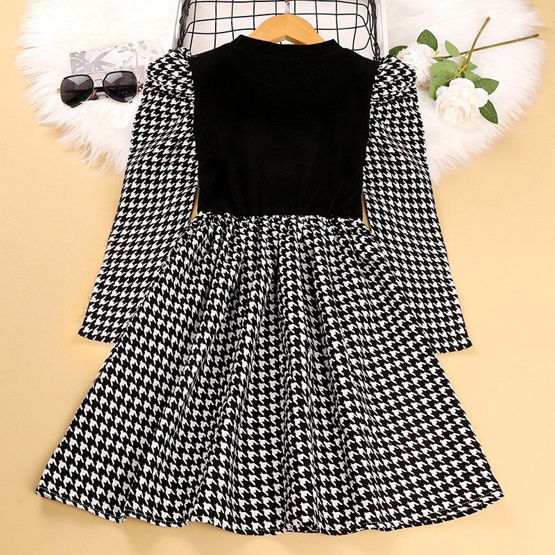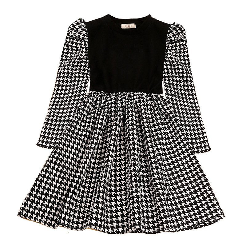 Girls Round Neck Long-sleeved Houndstooth Spliced Dress