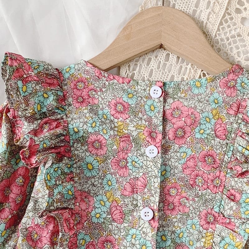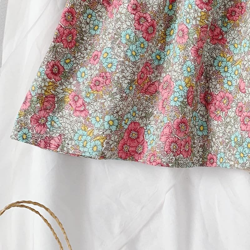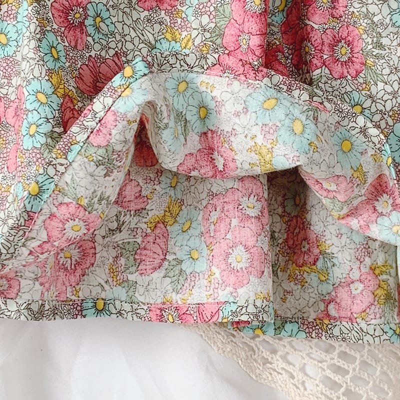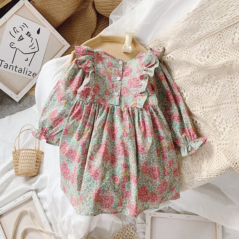 Girls Round Neck Long-sleeves Ruffled Floral Dress