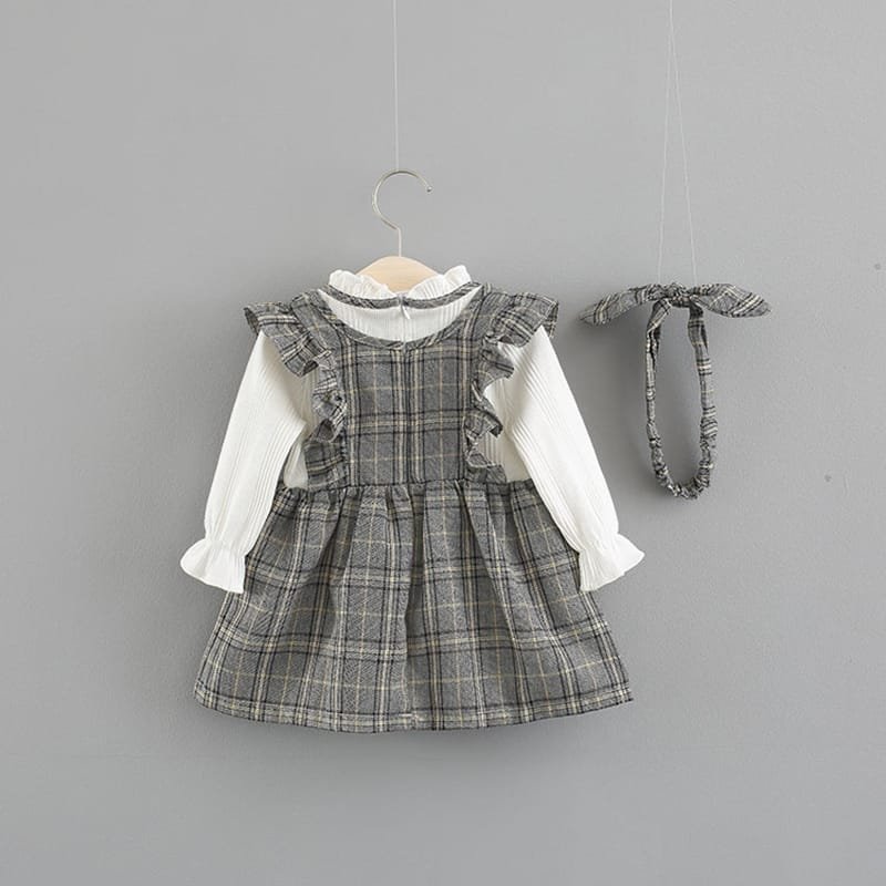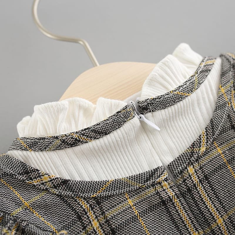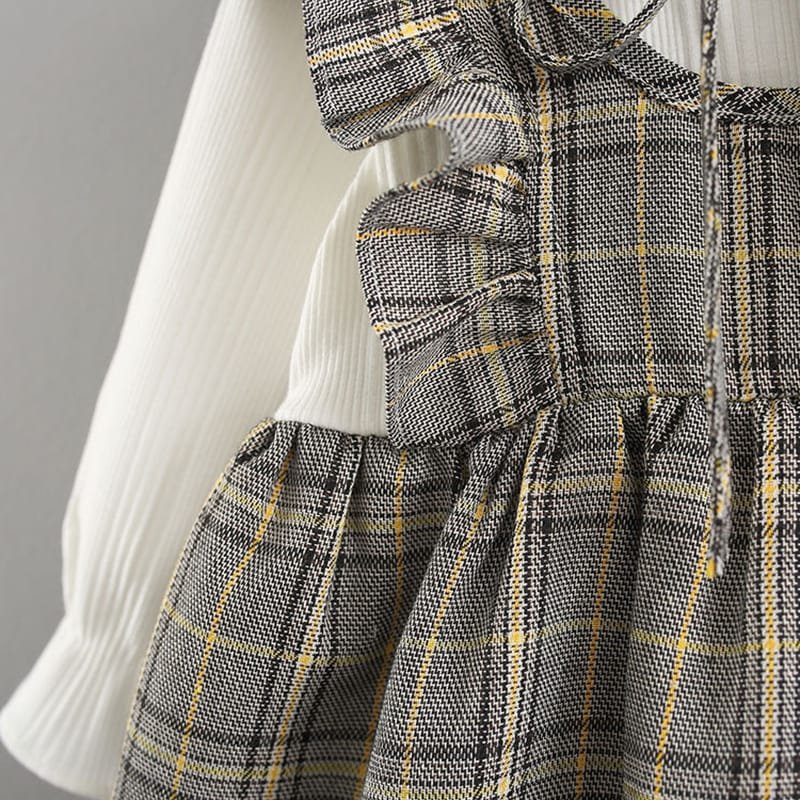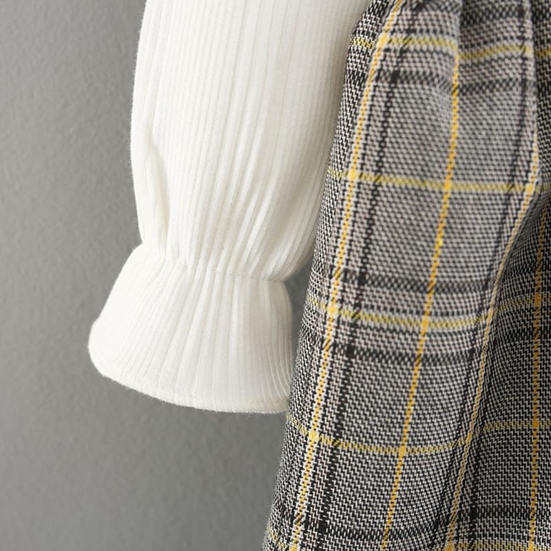 Girls Ruffled Cuff Design Plaid Spliced Dress With Headband