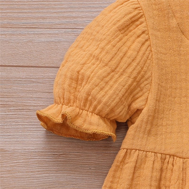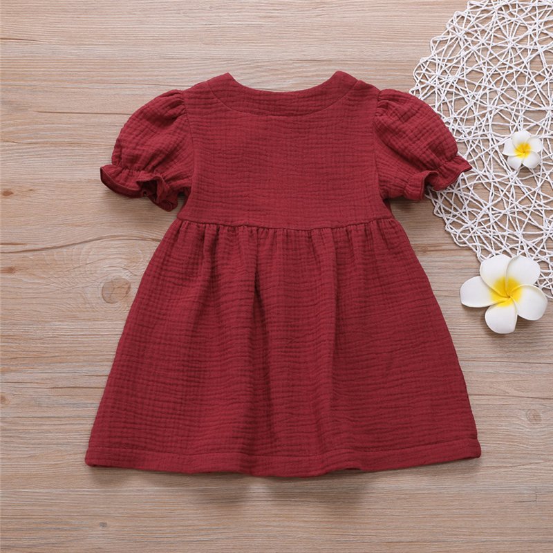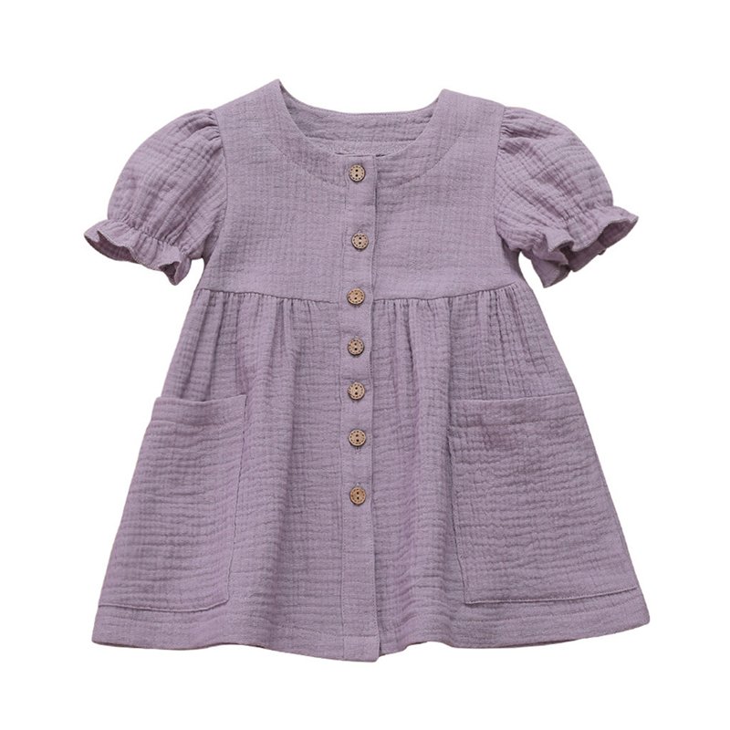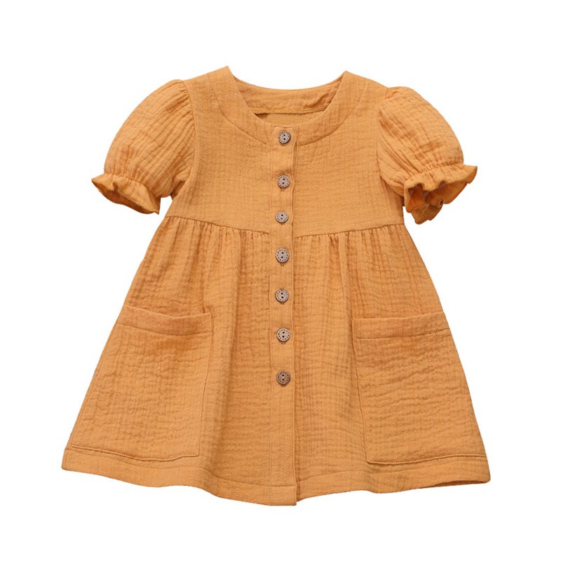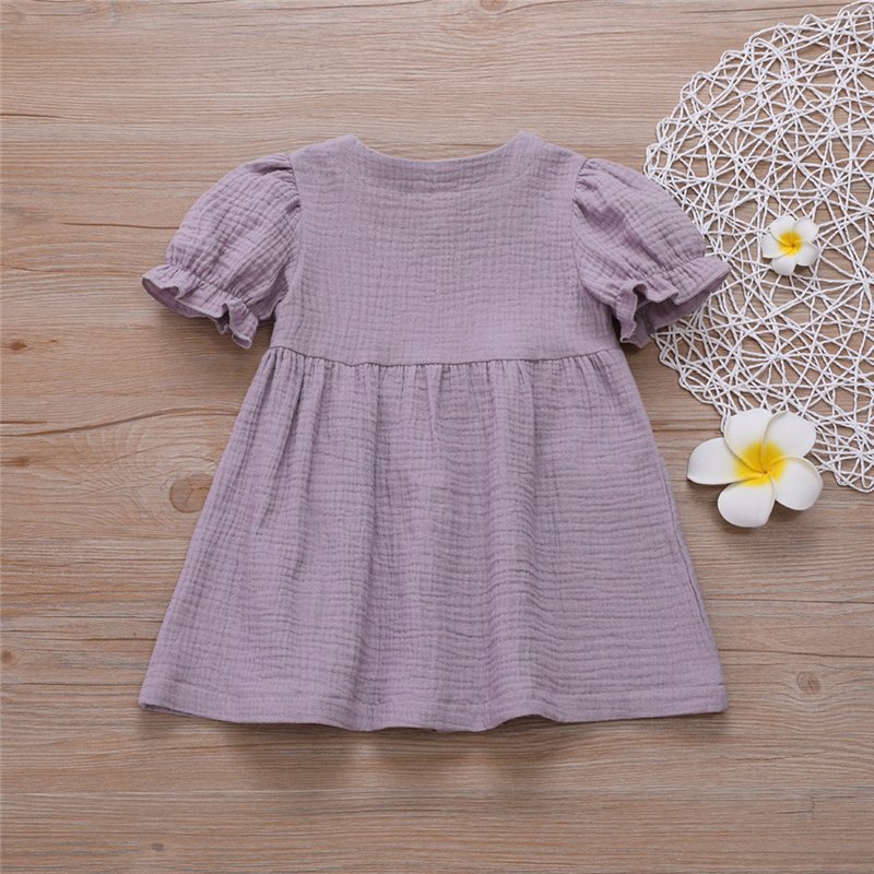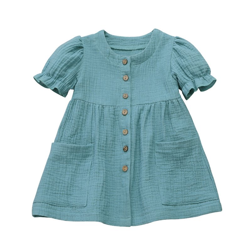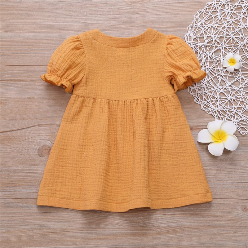 Girls Simple Solid Color Single-breasted Short-sleeves Dress