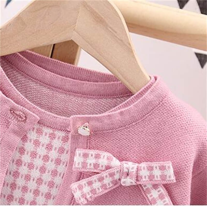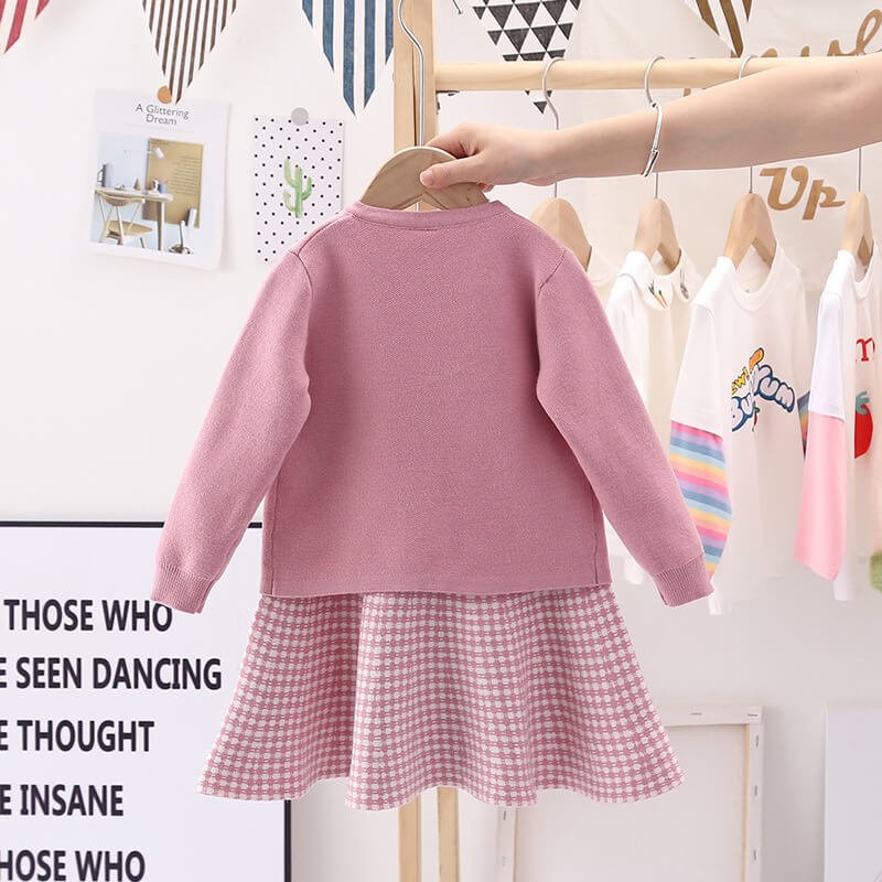 Girls Solid Color Bow Decor Coat And Plaid Sleeveless Dress Set