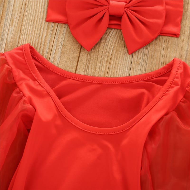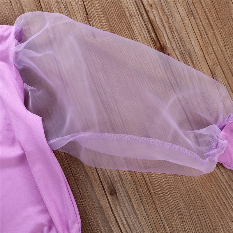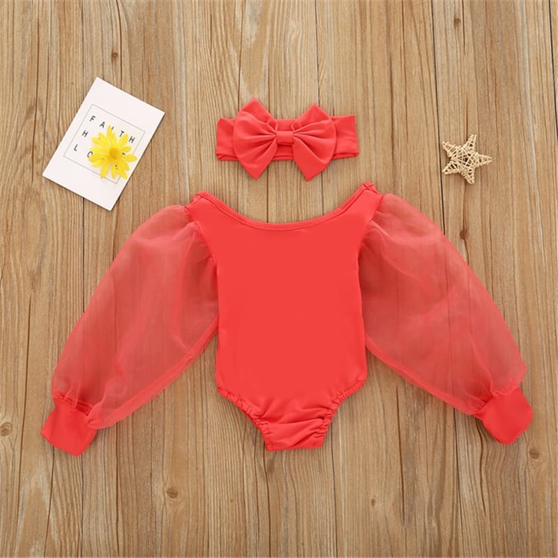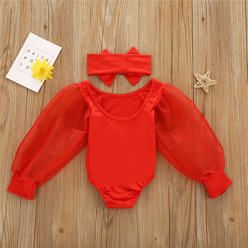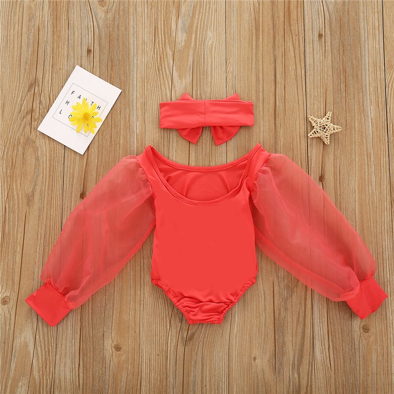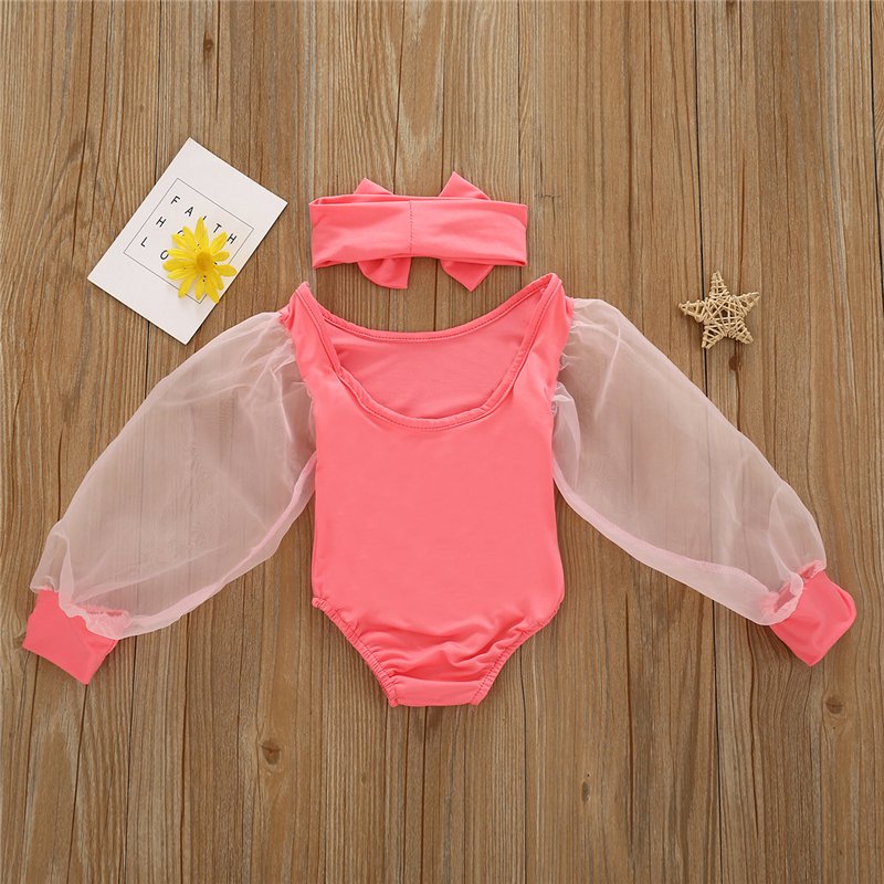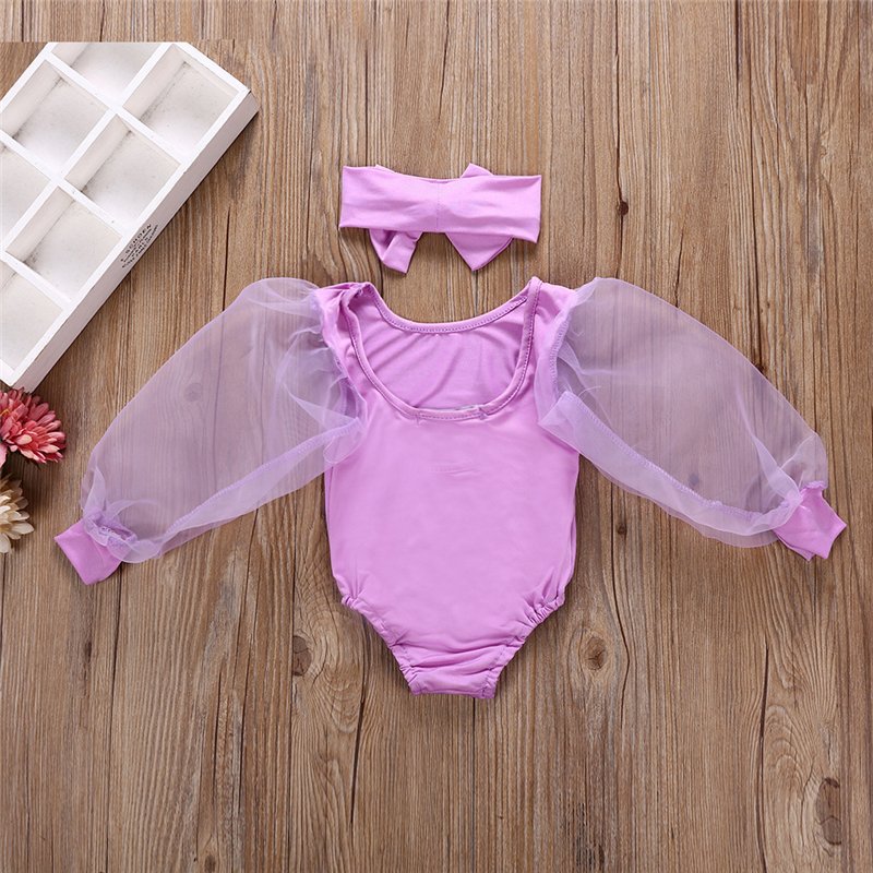 Girls Solid Color Mesh Long-sleeves Romper And Headband Set