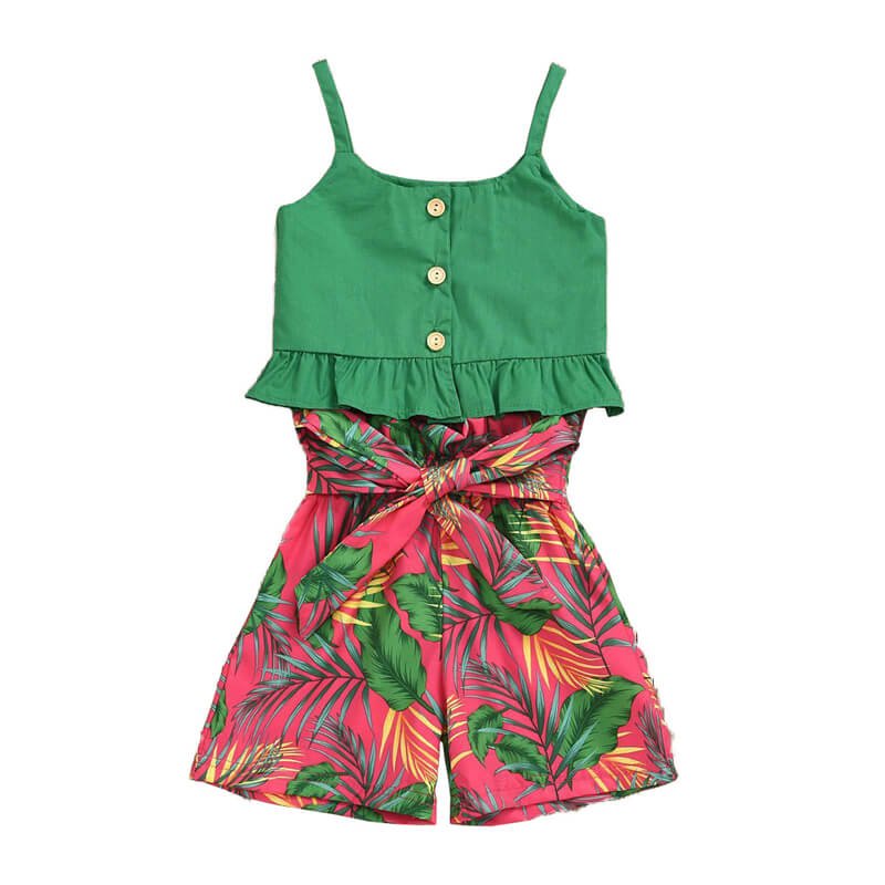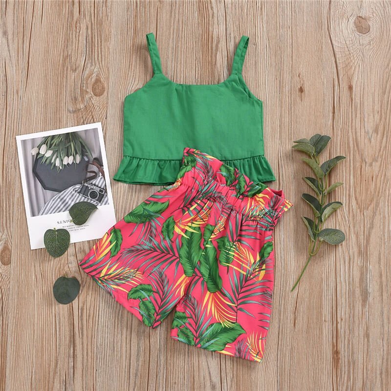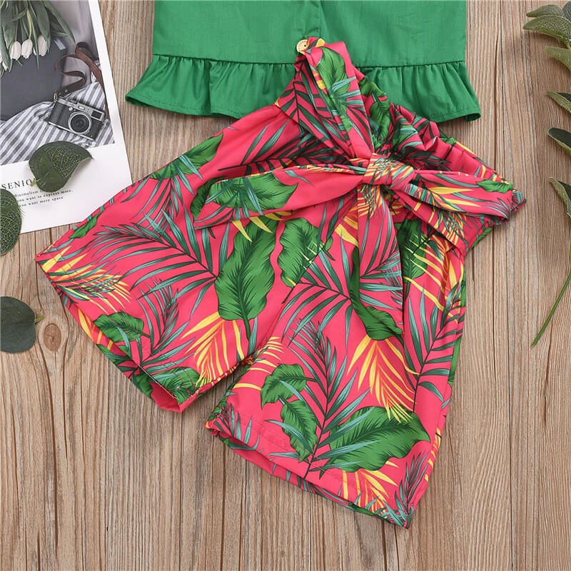 Girls Stringy Selvedge Design Tops And Plants Pattern Shorts Set