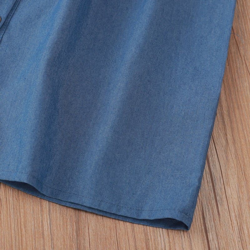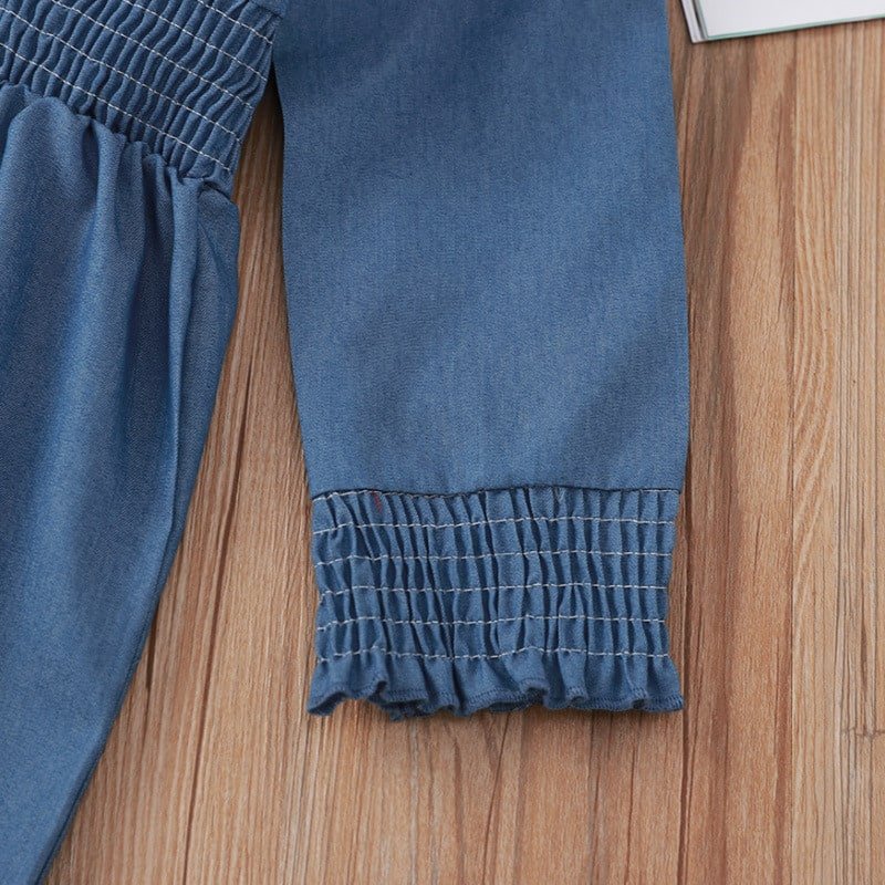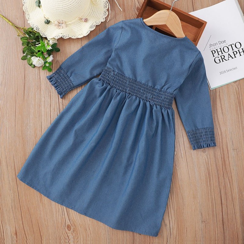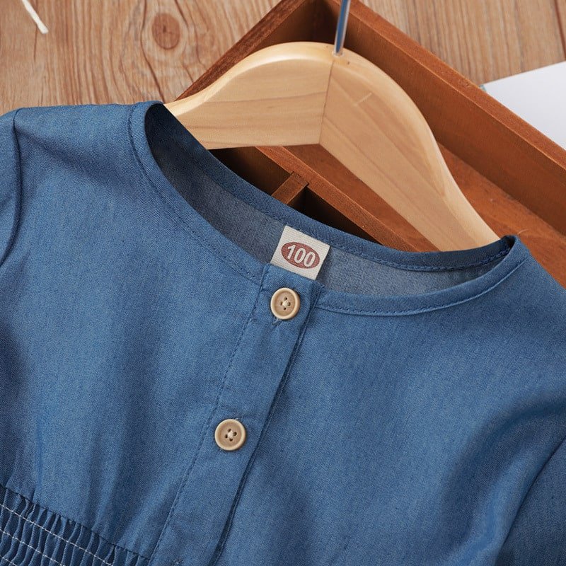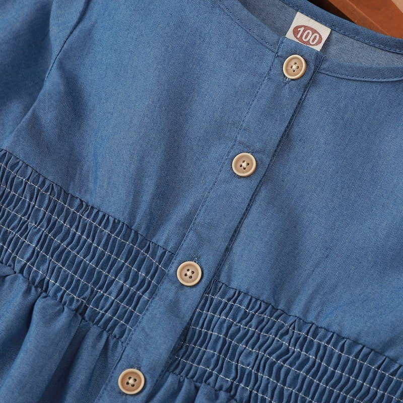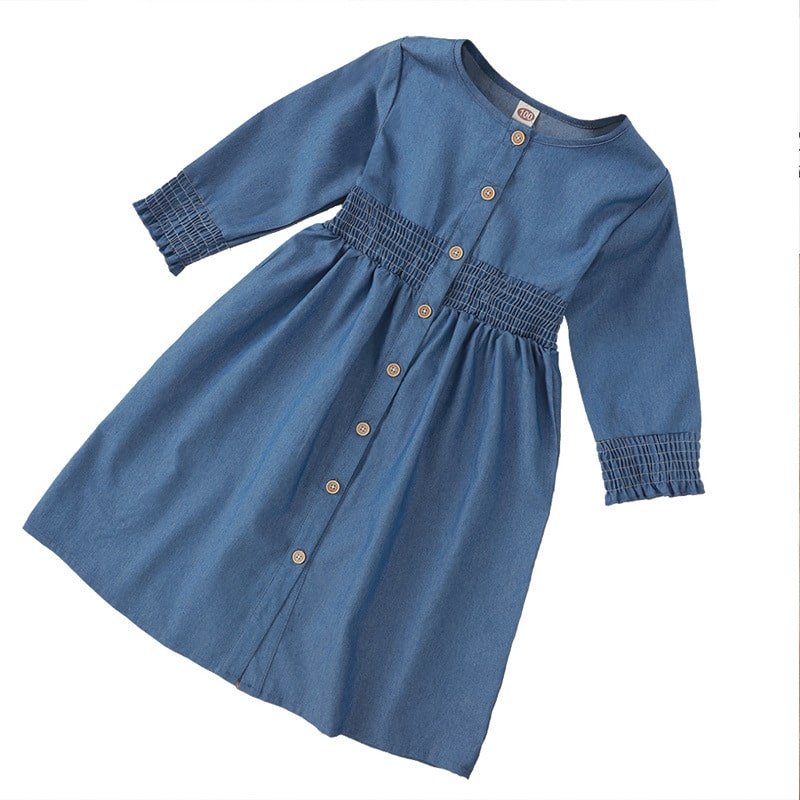 Girls Summer Casual Long-sleeved Round Neck Single-breasted Elastic Creased Dress