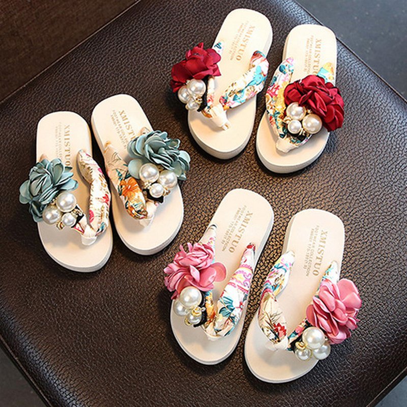 Girls Summer Imitation Pearls Flower Beach Flip Flops