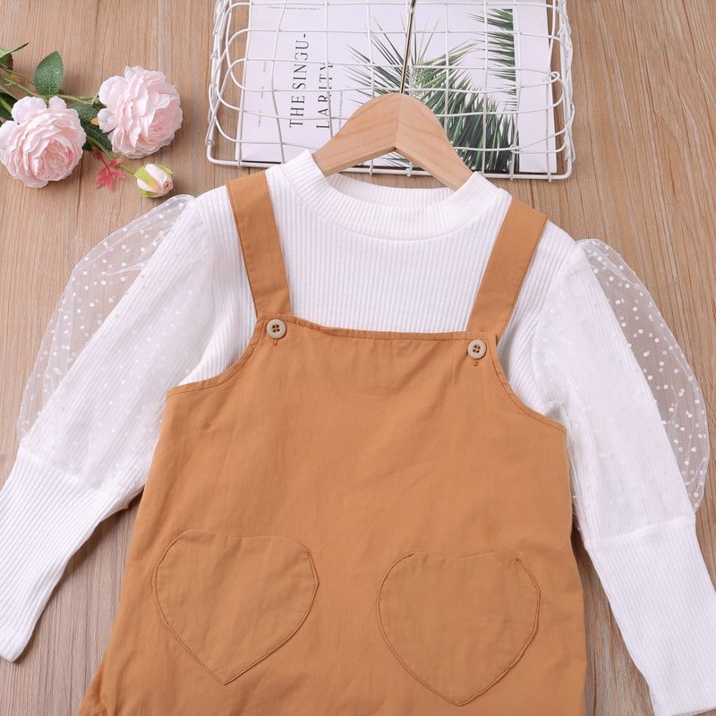 Girls Sweet Long Sleeve Mesh Spliced Top Suspender Skirt Set