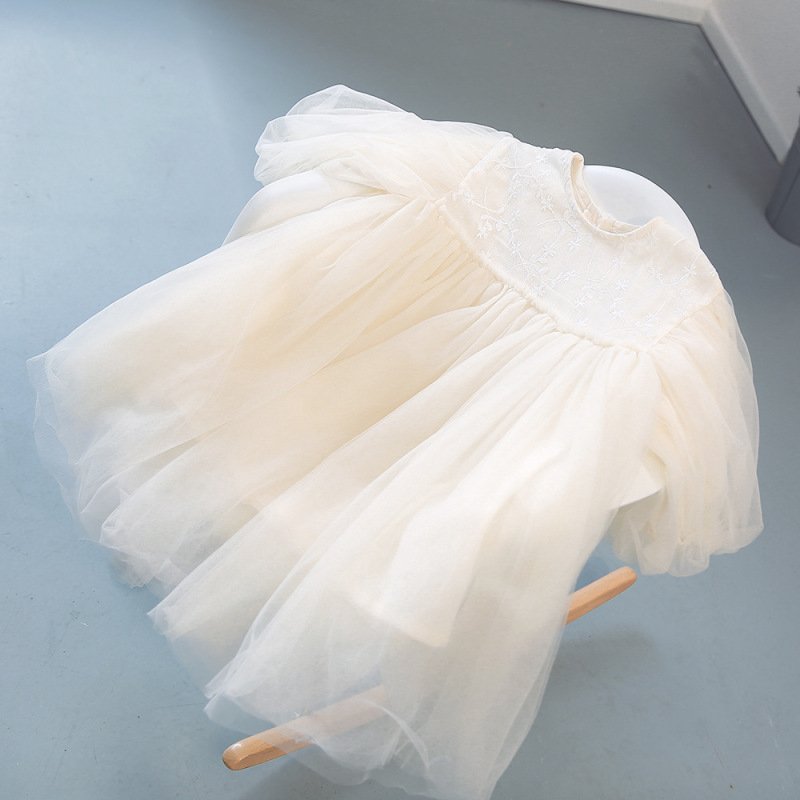 Girls Sweet Solid Color Round Neck Flower Embroidery Puff Long Sleeve Mesh Dess