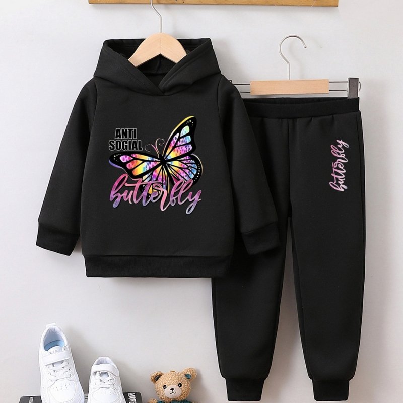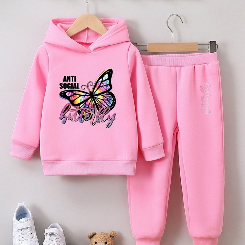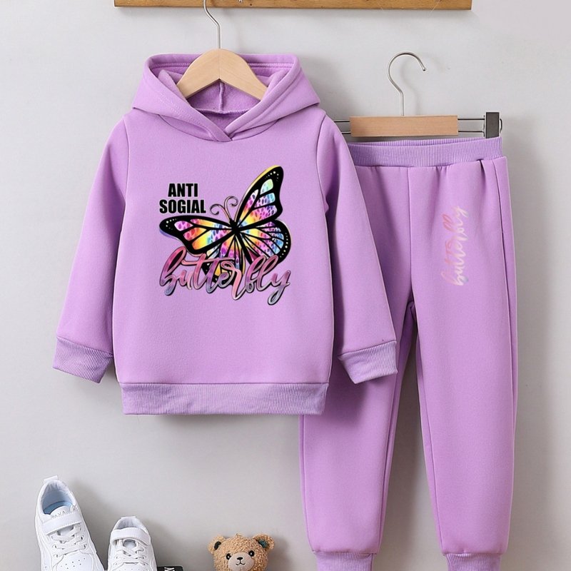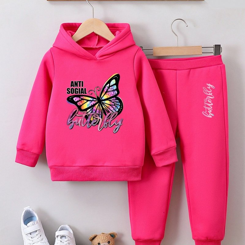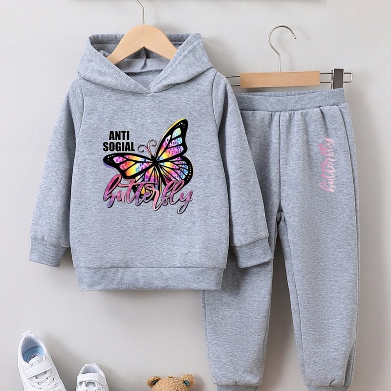 Girls Winter Fashion Butterfly Print Hoodie And Pants Fleece-Lined Warm Two-Piece Set