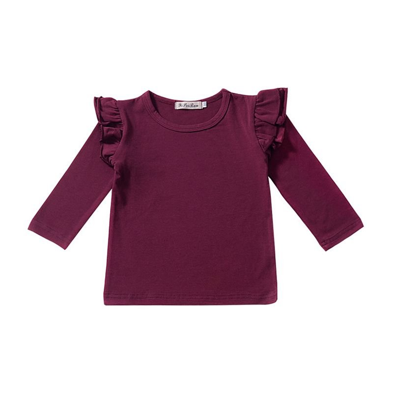 Hot Sale Lovely Girls Cotton Solid Color Ruffle Long Sleeves Blank Simple Style Tops