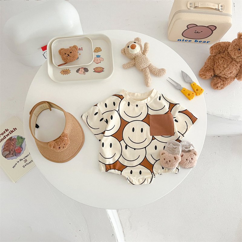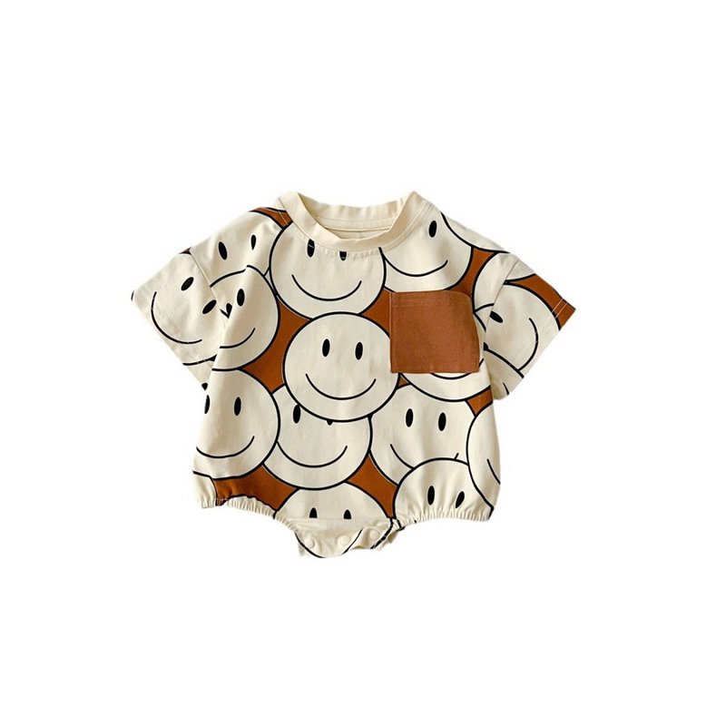 Khaki Smiling Face Full Printed Baby Short Sleeve Rompers
