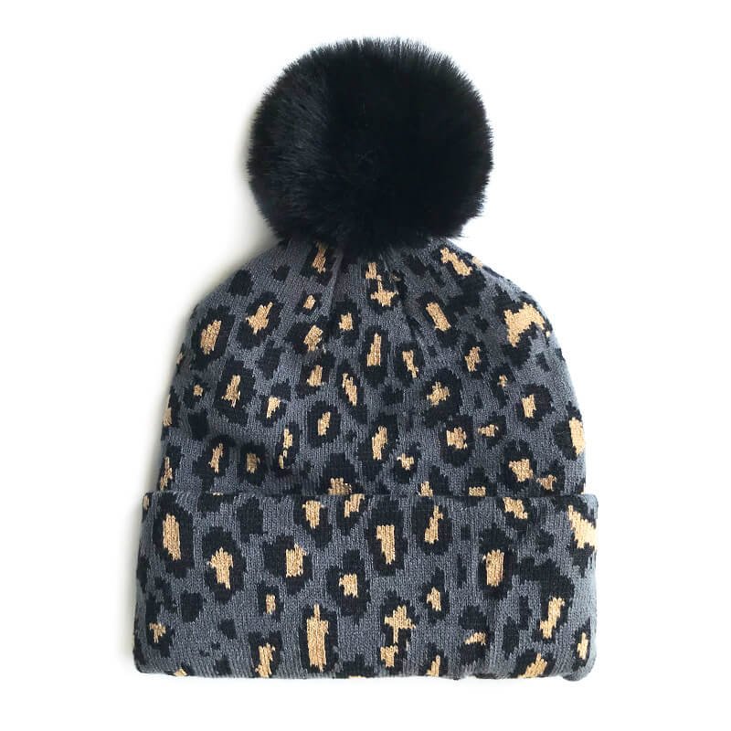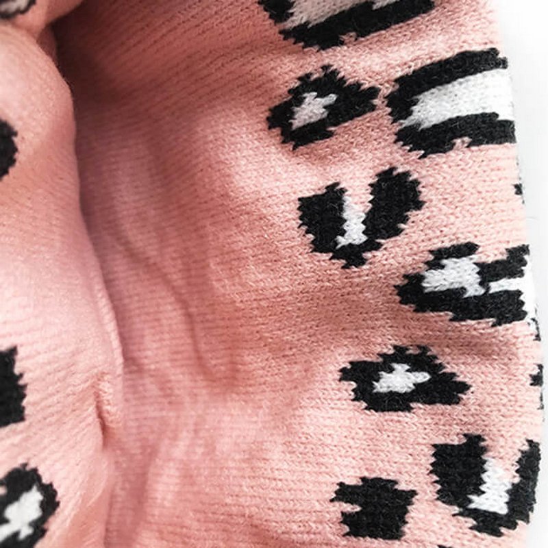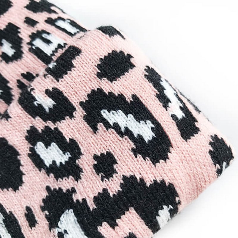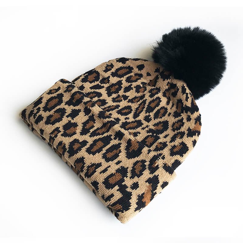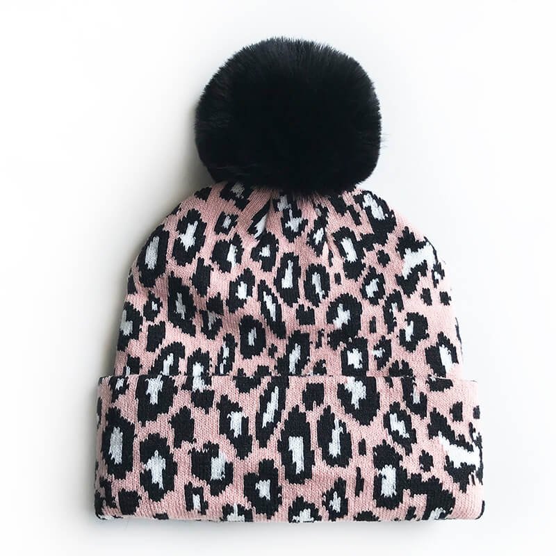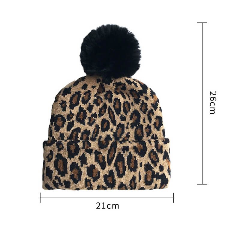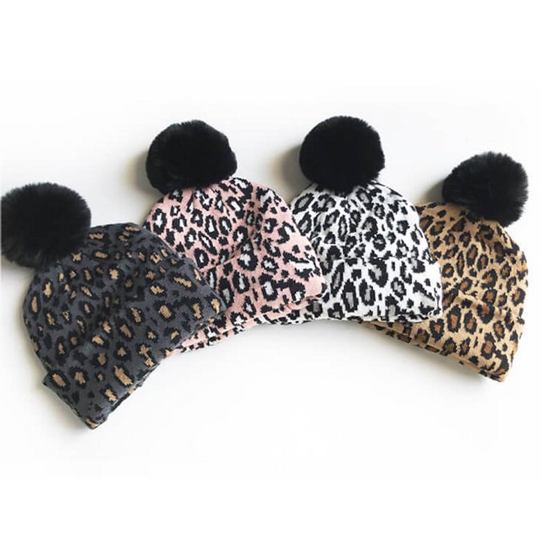 Kids Autumn And Winter Leopard Printed Knitted Hat With Plush Ball Decoration