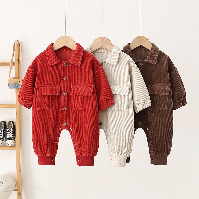 Kids Baby Boys Fashion Casual Solid Color Corduroy Long Sleeve Lapel Romper