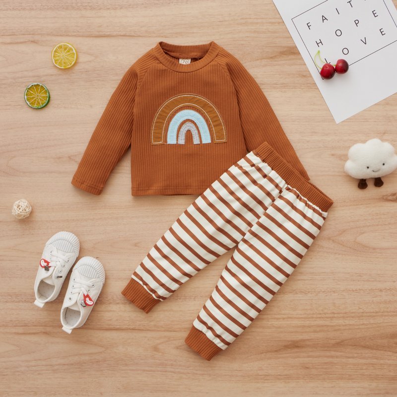 Kids Baby Boys Girls Autumn Winter Casual Cute Rainbow Stripe Print Long Sleeve Round Neck Sweatshirts Pants Long Set