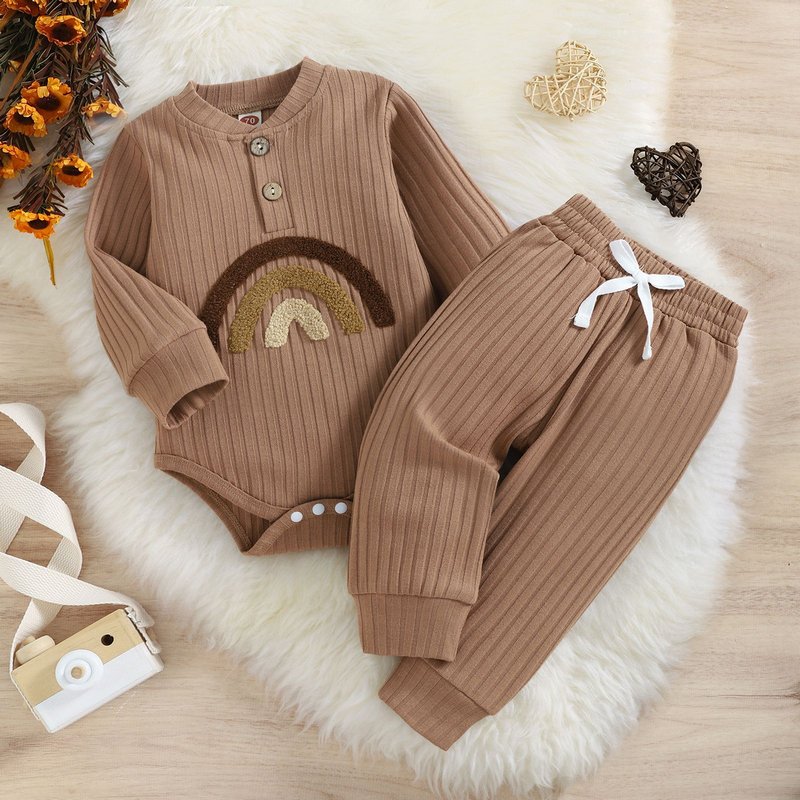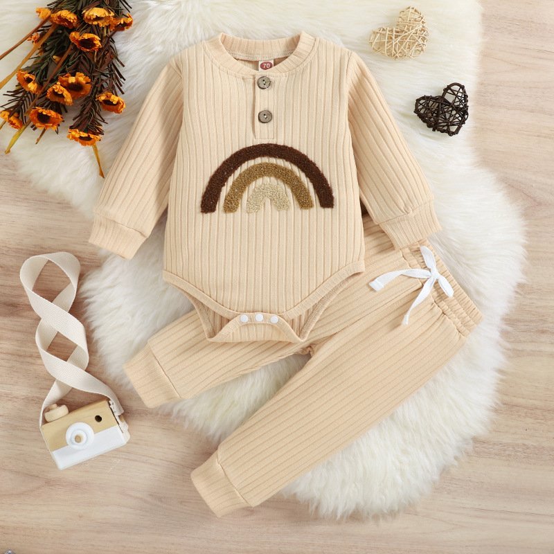 Kids Baby Boys Girls Casual Cute Basic Rainbow Stripe Long Sleeve Round Neck Romper Trousers Sets