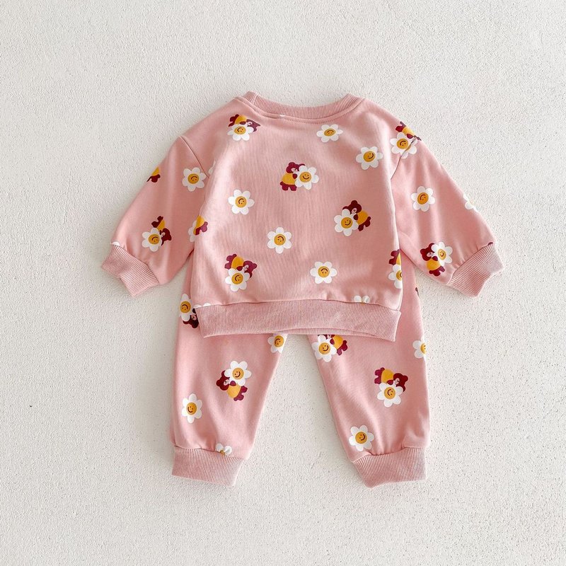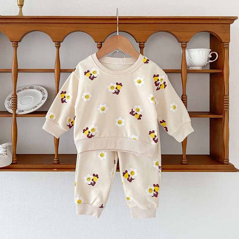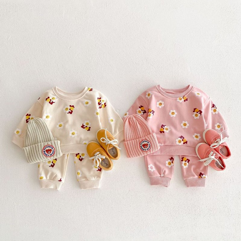 Kids Baby Boys Girls Casual Cute Cartoon Bear Flower Print Long Sleeve Sweatshirts Pants Sets