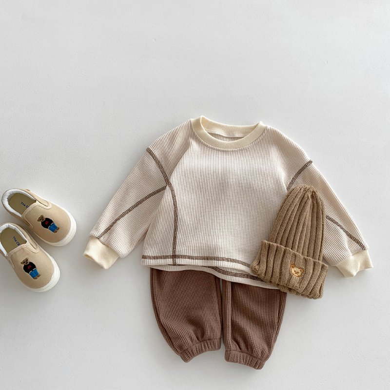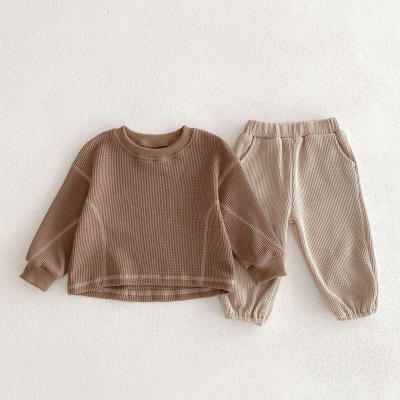 Kids Baby Boys Girls Casual Cute Waffle Stripe Long Sleeve T-Shirt Pants Sets
