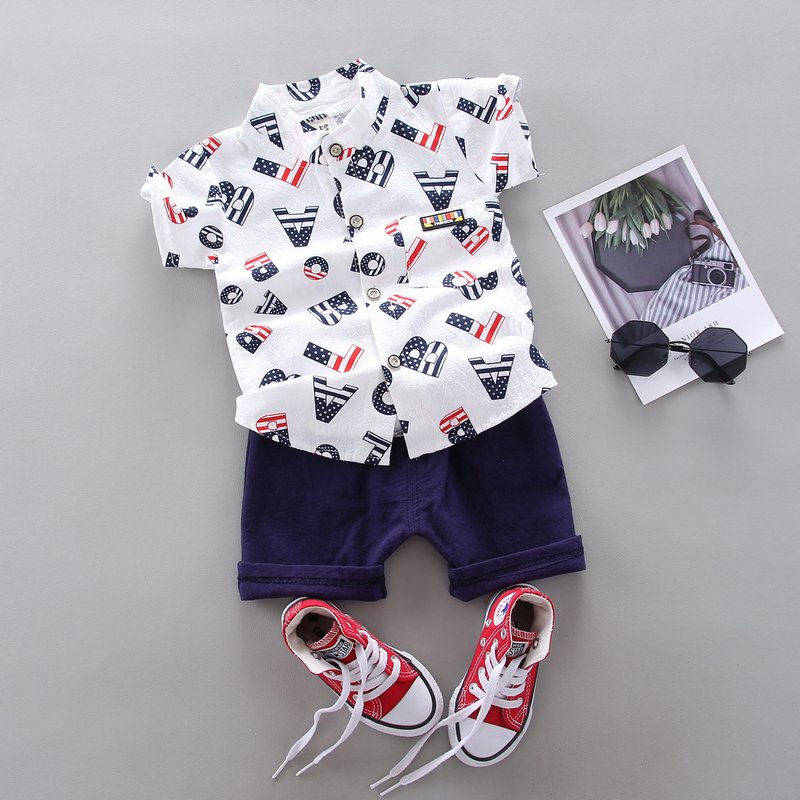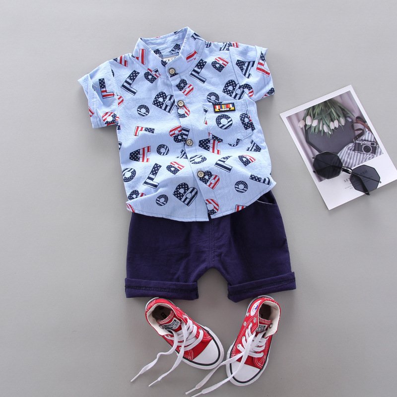 Kids Baby Boys Summer Fashion Casual Cotton Elephant Dinosaur Bear Airplane Car Cartoon Button Stand Collar Two-Piece Set
