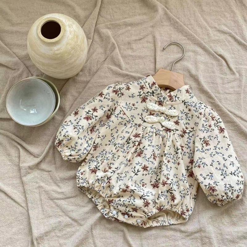 Kids Baby Girl Retro Mandarin Collar Double-Breasted Flower Printing Long Sleeve Romper