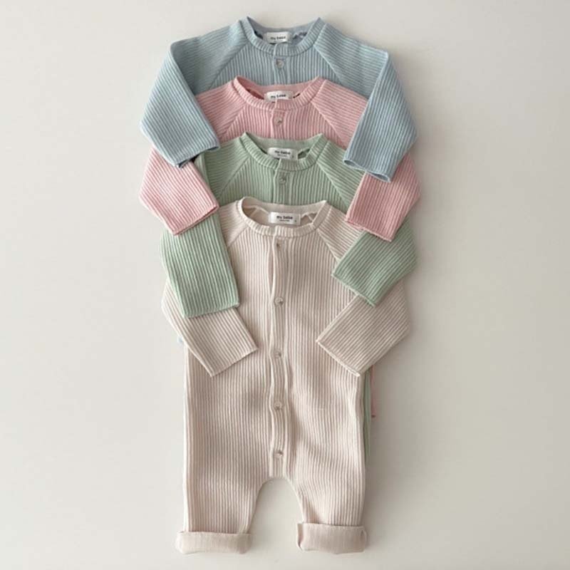 Kids Baby Girls Boys Casual Cute Solid Color Stripe Single-Breasted Long Sleeve Round Neck Romper