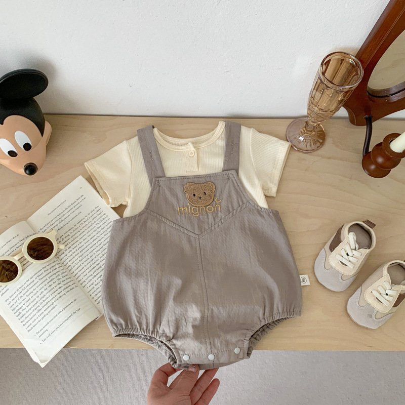Kids Baby Girls Boys Solid Color Cotton Short-Sleeved Round Neck Top And Strap Bear Letter Embroidered Bodysuit Two-Piece Set