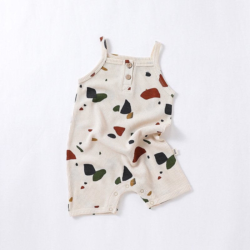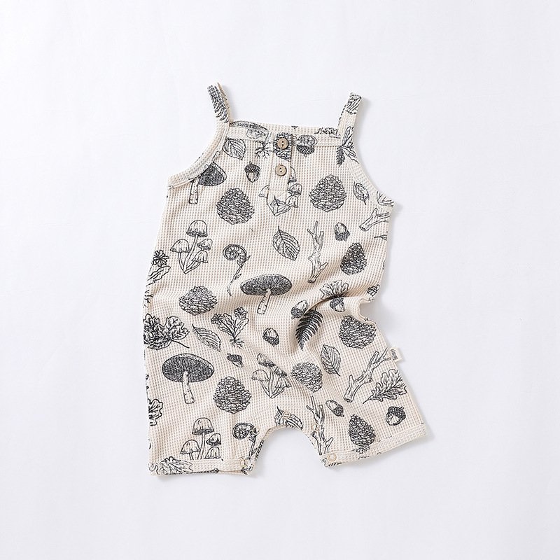 Kids Baby Girls Boys Summer Cute Cotton Waffle Sun Mushroom Colorblock Button Sleeveless Square Neck Romper