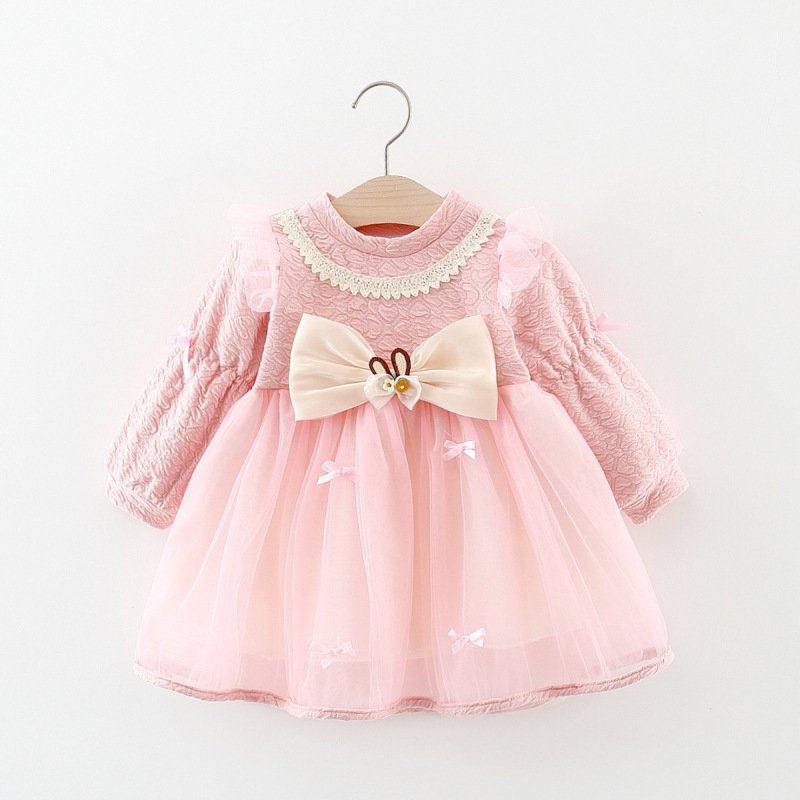 Kids Baby Girls Casual Cute Bow Long Sleeve Round Neck Mesh Dress