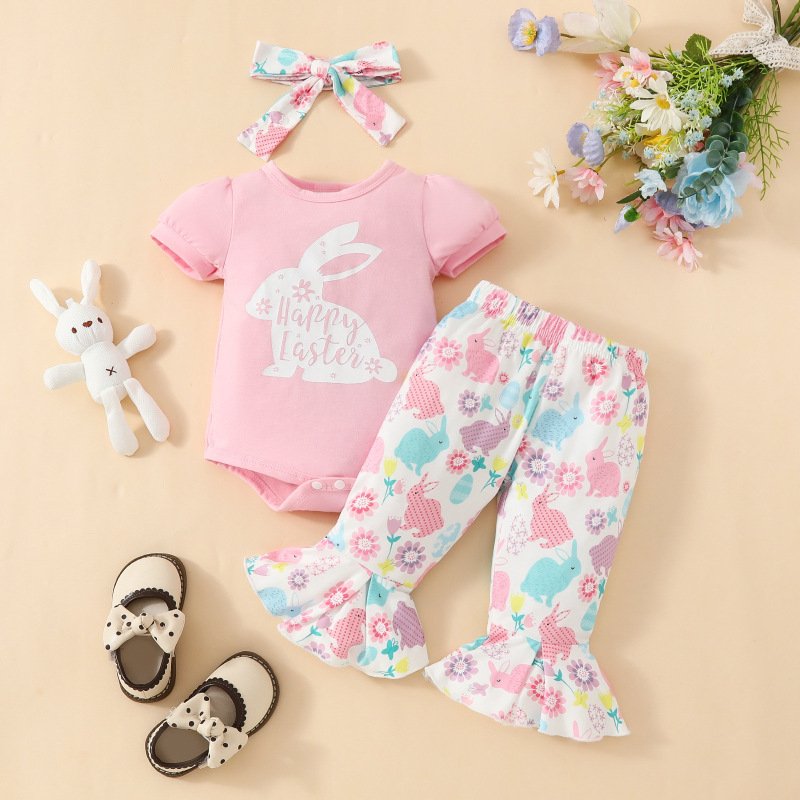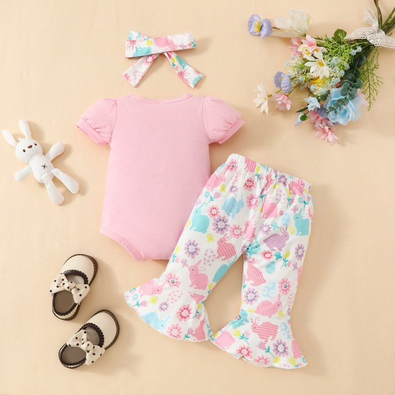 Kids Baby Girls Casual Cute Easter Alphabet Cartoon Rabbit Print Short Sleeve Round Neck Romper Flare Trousers Set