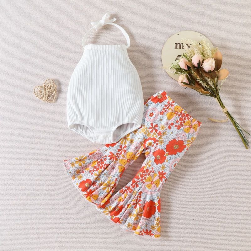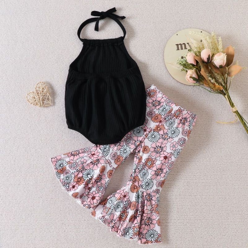 Kids Baby Girls Casual Cute Floral Print Sleeveless Halter Neck Romper Flare Trousers Set