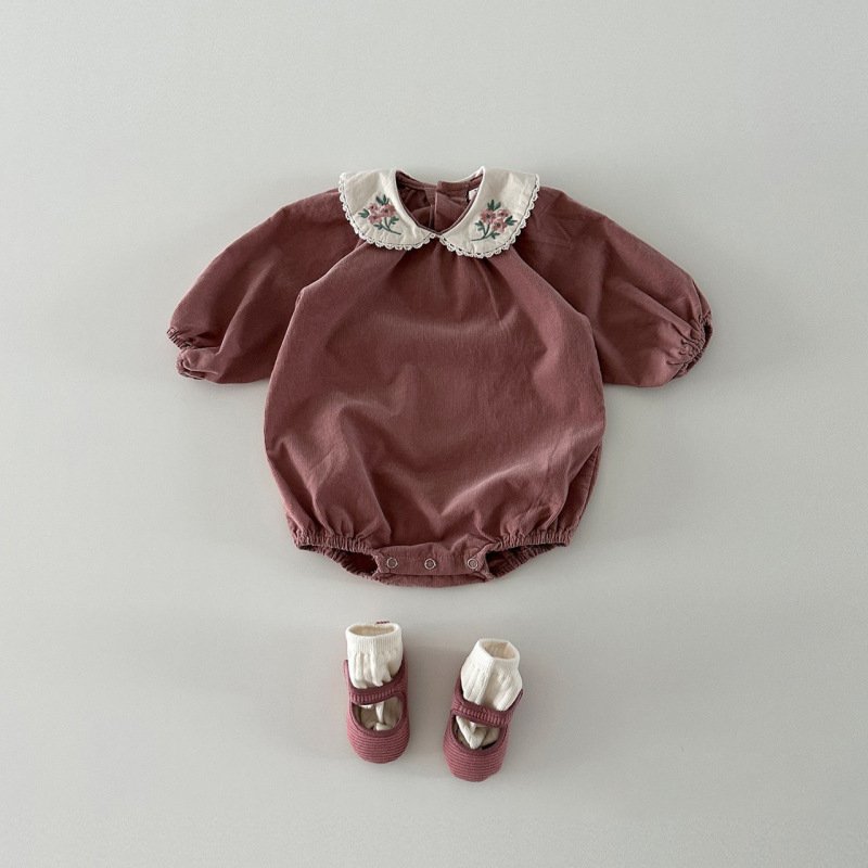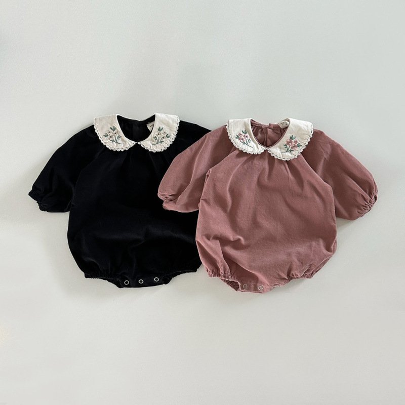 Kids Baby Girls Casual Cute Flower Embroidery Long Sleeve Peter Pan Collar Romper