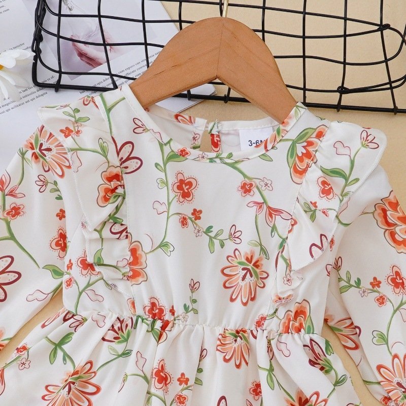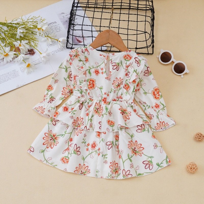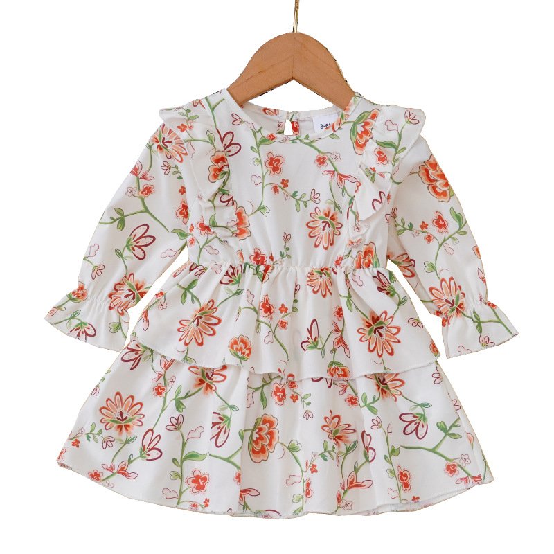 Kids Baby Girls Casual Cute Flower Print Long Sleeve Dress