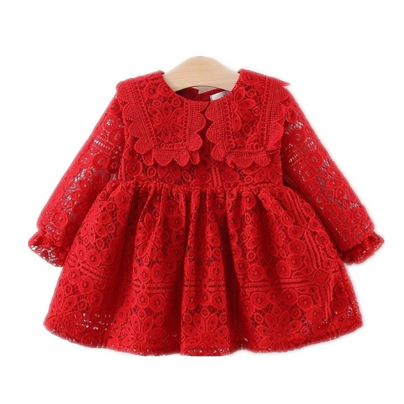 Kids Baby Girls Casual Cute Solid Color Lace Hollow Long Sleeve Lapel Dress