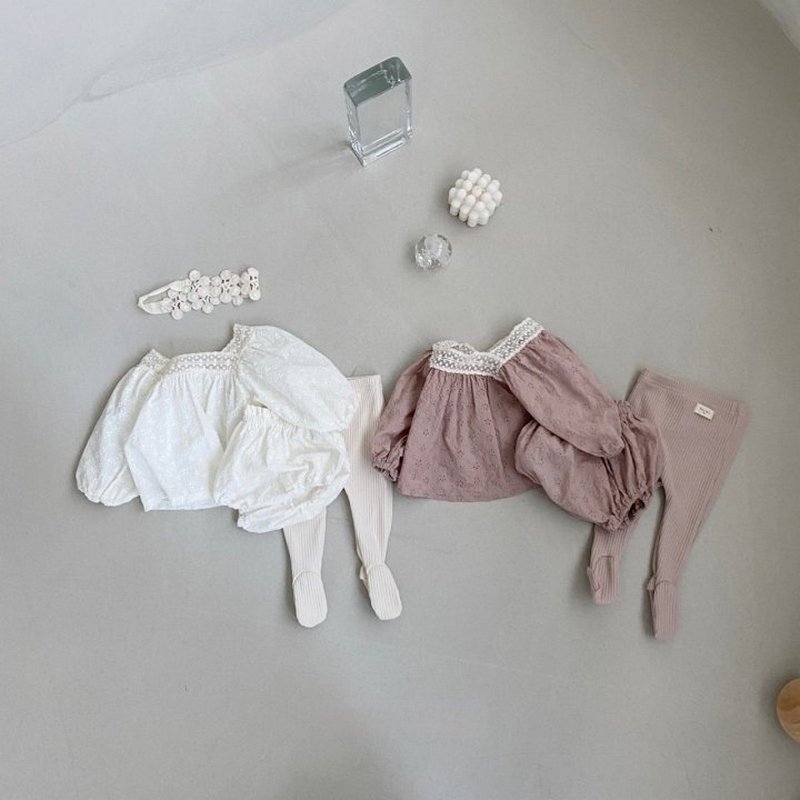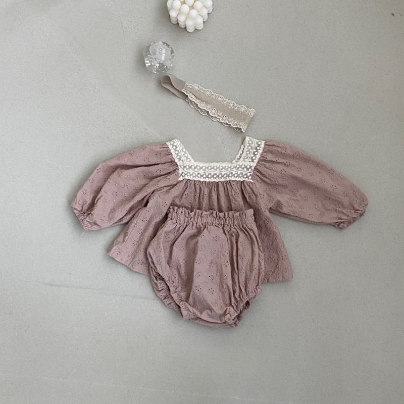 Kids Baby Girls Casual Cute Tiny Flower Hollow Long Sleeve Square Neck Top Shorts Set