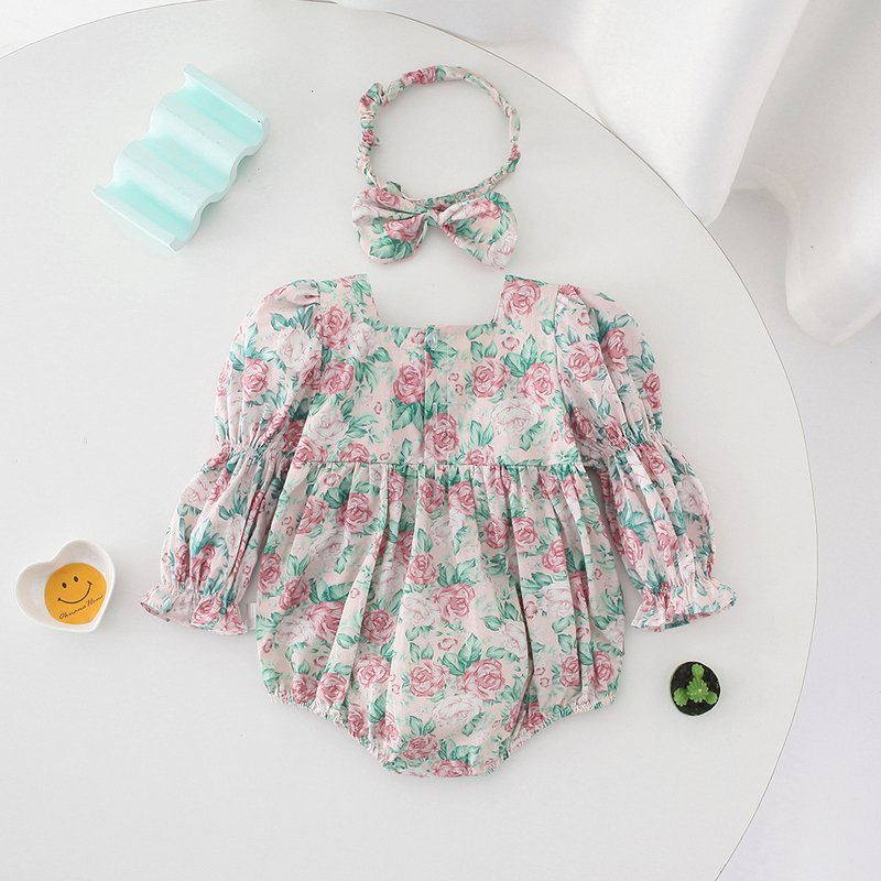 Kids Baby Girls Casual Cute Tiny Flower Print Bow Long Sleeve Romper