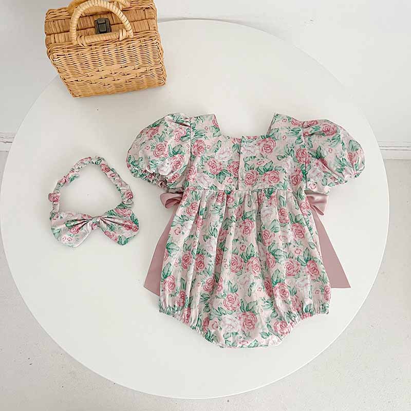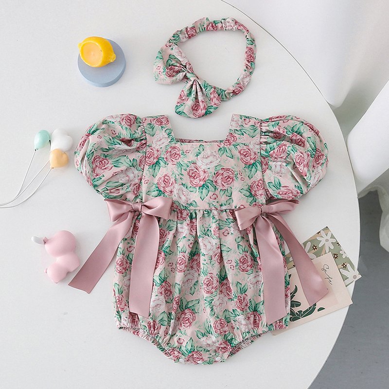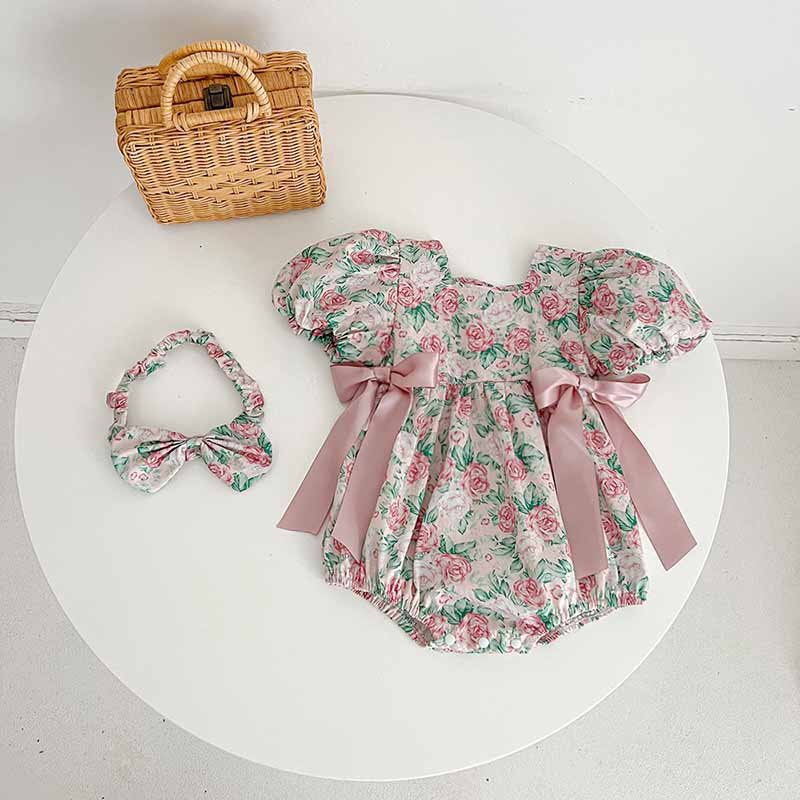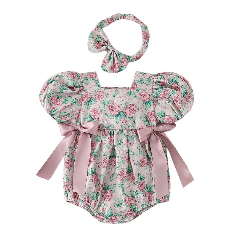 Kids Baby Girls Casual Cute Tiny Flower Print Bow Puff Sleeve Romper