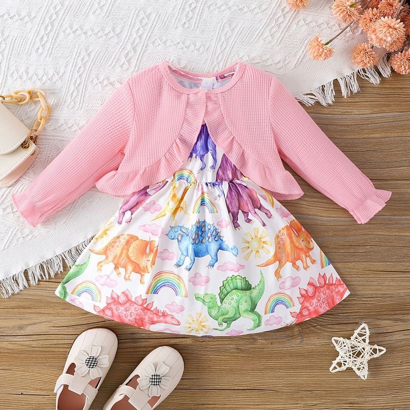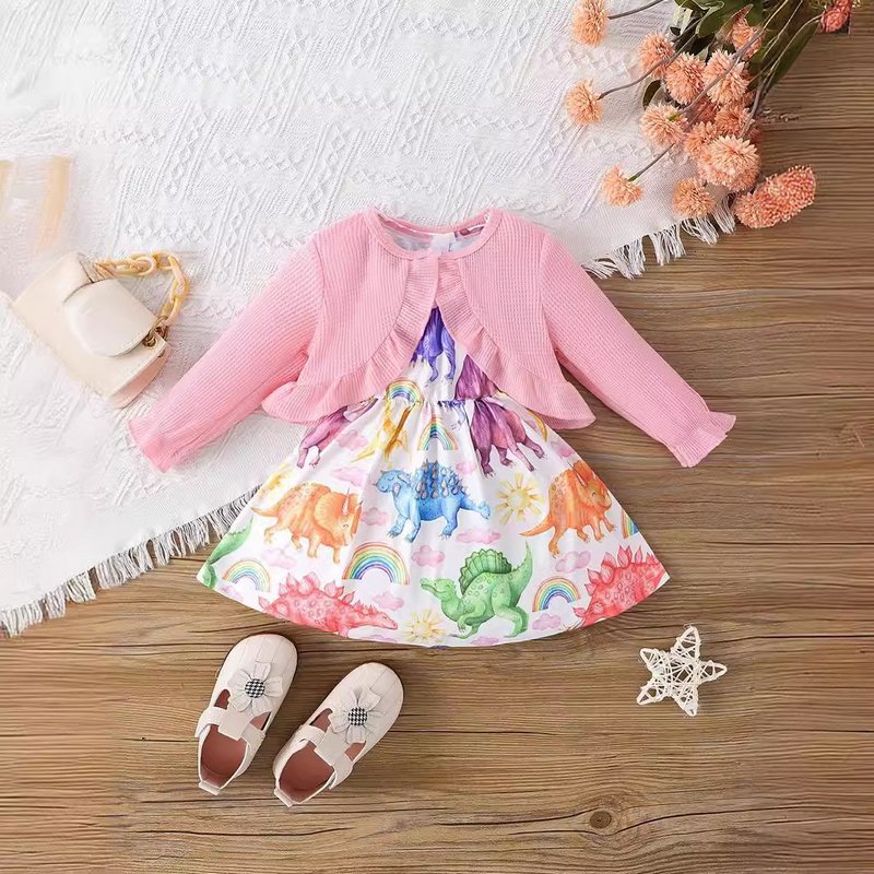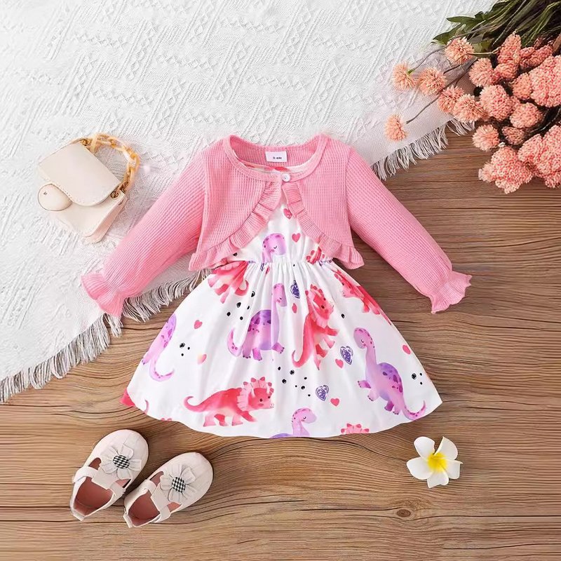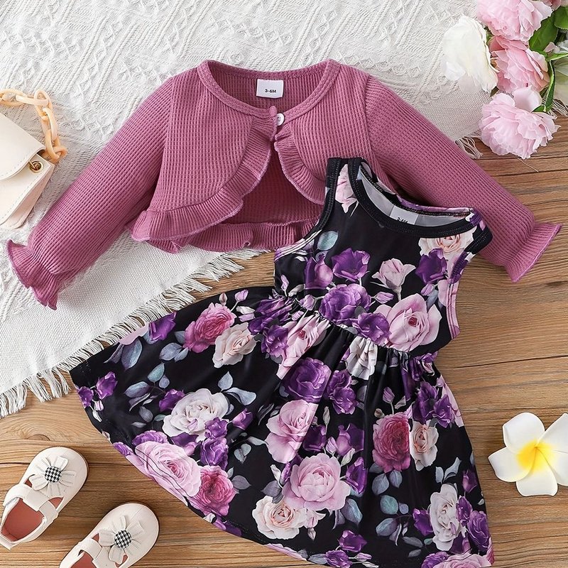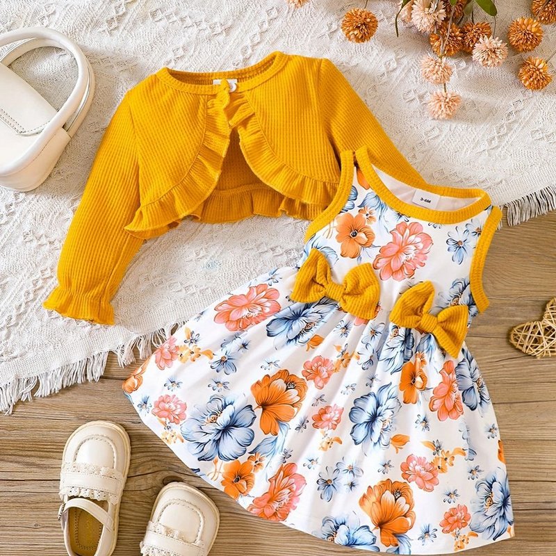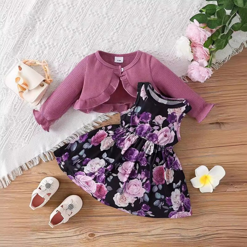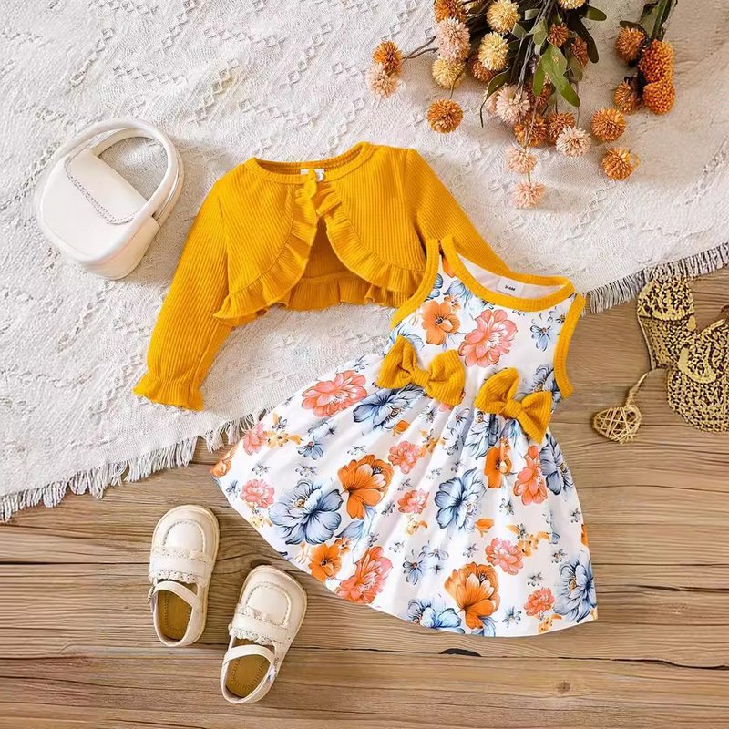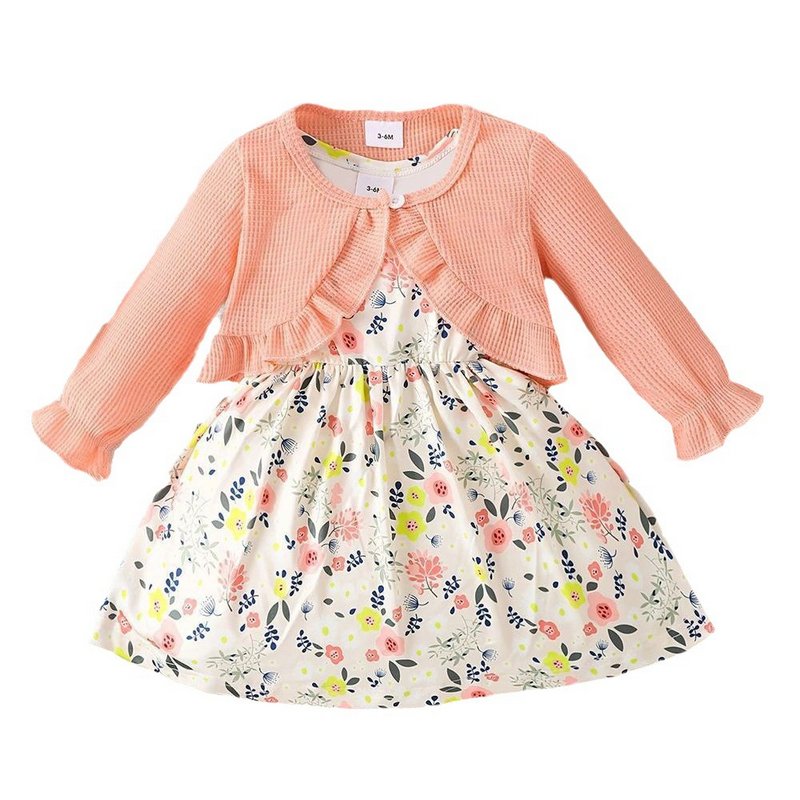Kids Baby Girls Casual Tiny Flower Print Long Sleeve Cardigan Knitted Top Dress Sets