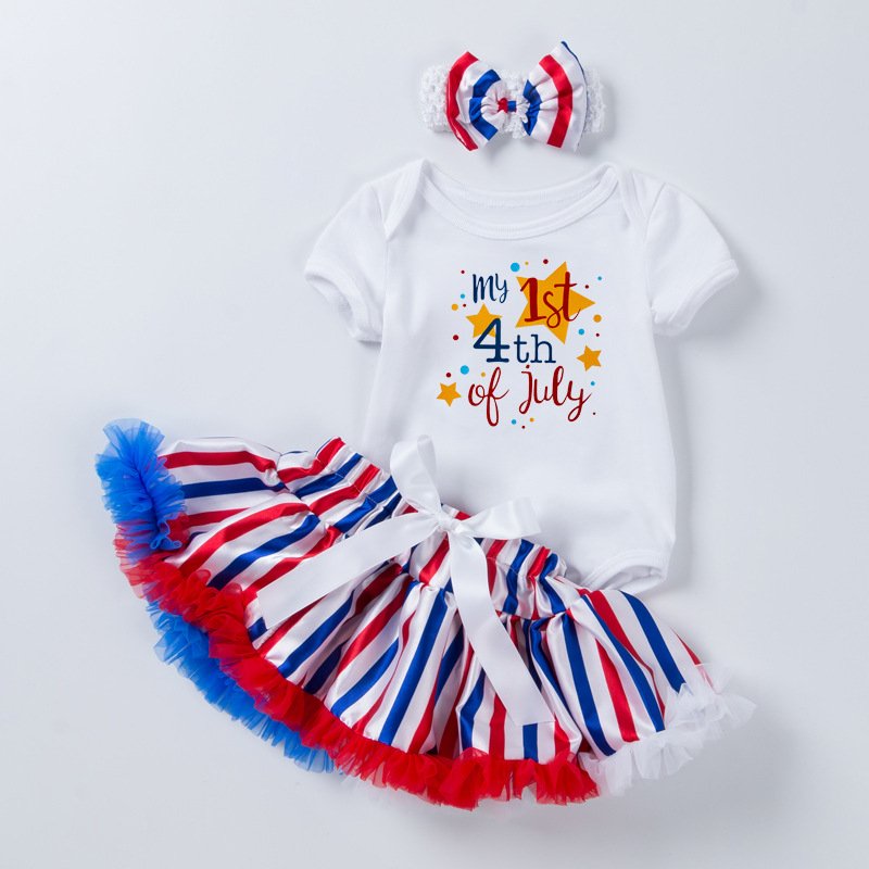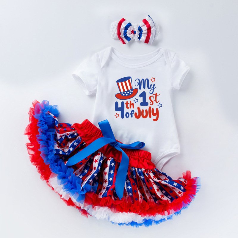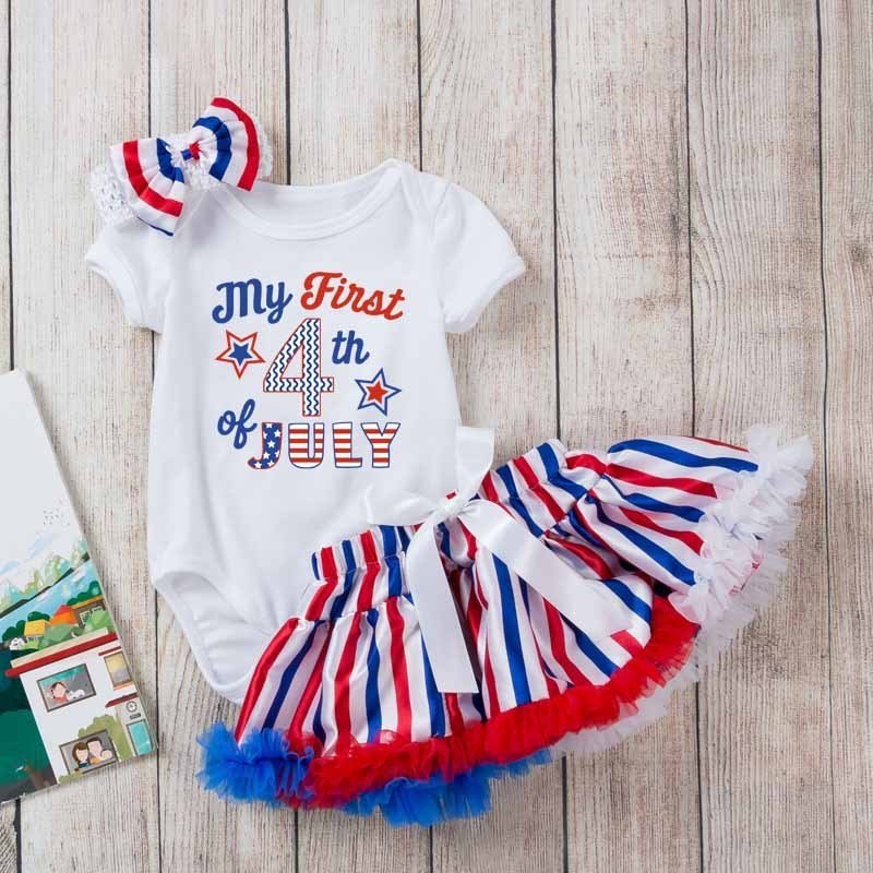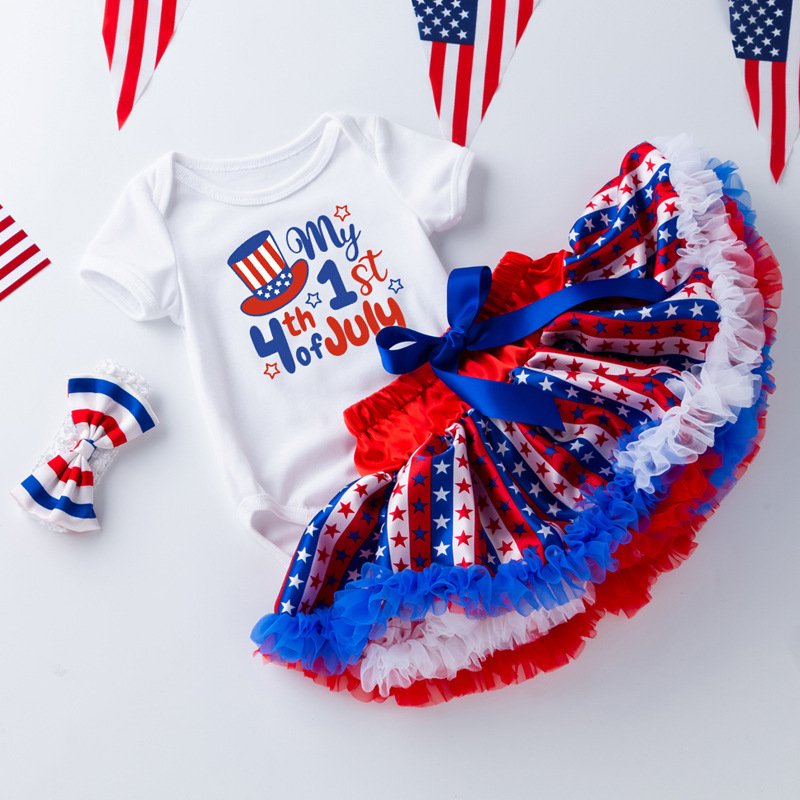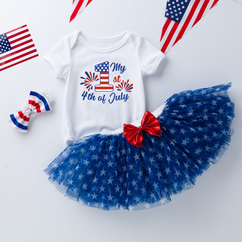 Kids Baby Girls Cute Party Independence Day Bow Print Romper Mesh Skirt Set