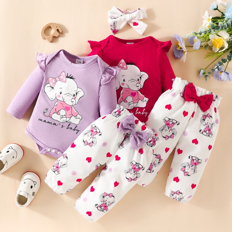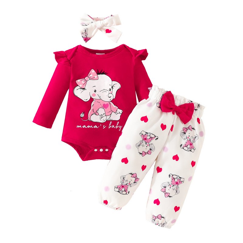 Kids Baby Girls Cute Sweet Cartoon Elephant Print Long Sleeve Round Neck Romper Trousers Set