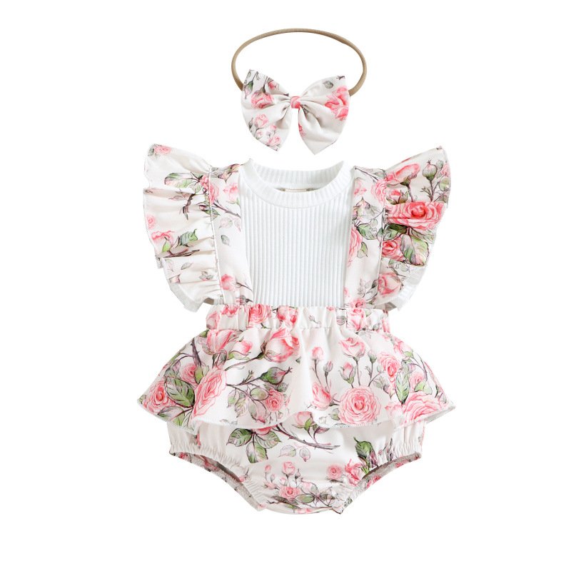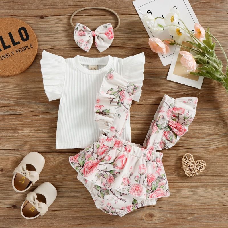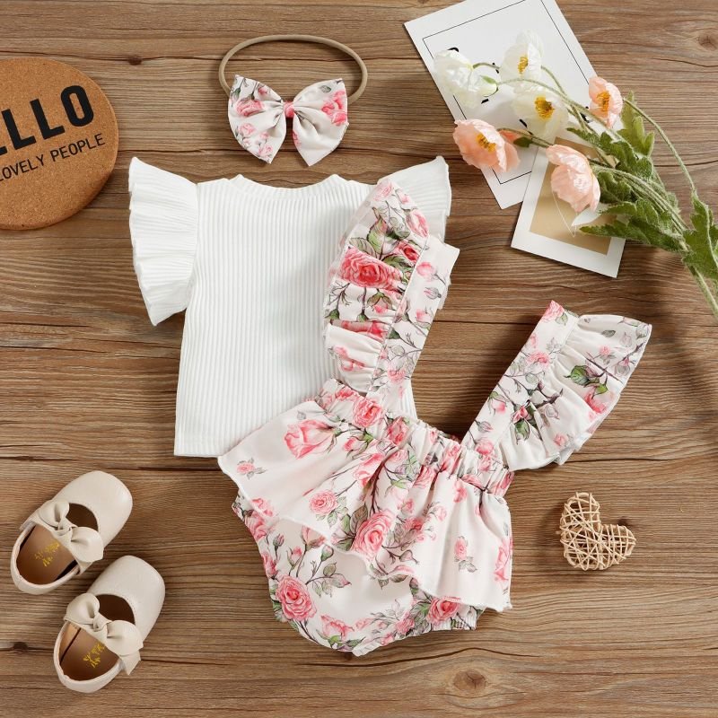 Kids Baby Girls Cute Sweet Solid Color Stripe Round Neck T-Shirt Floral Romper Set
