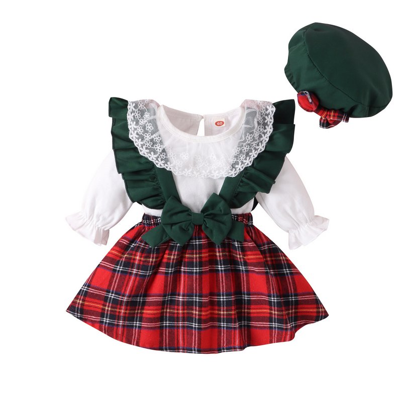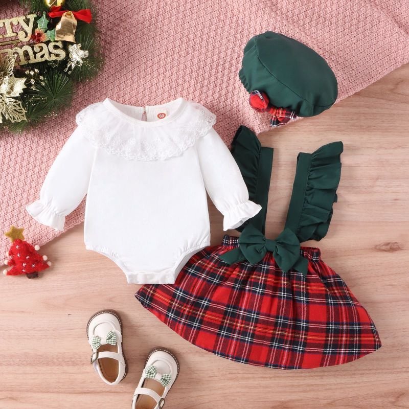 Kids Baby Girls Fashion Casual Christmas Solid Color Long Sleeve Round Neck Romper Playd Bow Skirt Sets