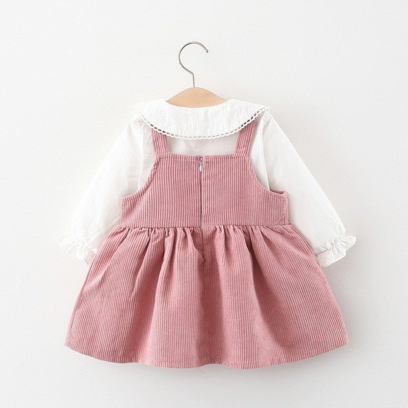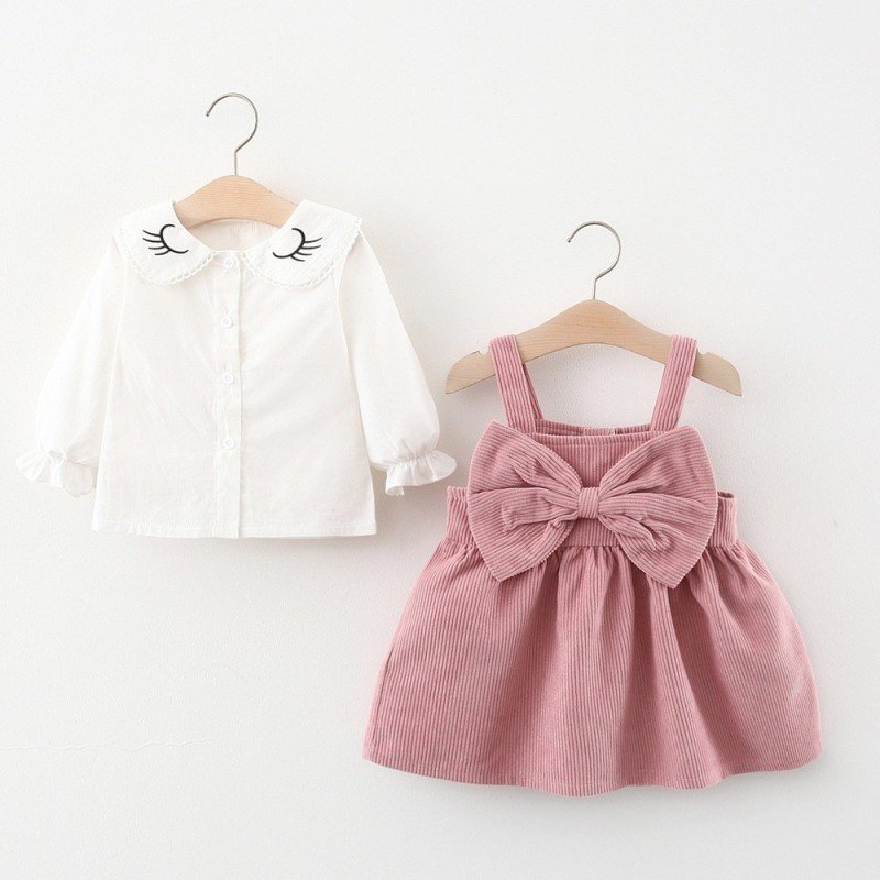 Kids Baby Girls Spring Autumn Cute Sweet Solid Color Long Sleeve Lapel Blouse Stripe Bow Strap Skirt Sets