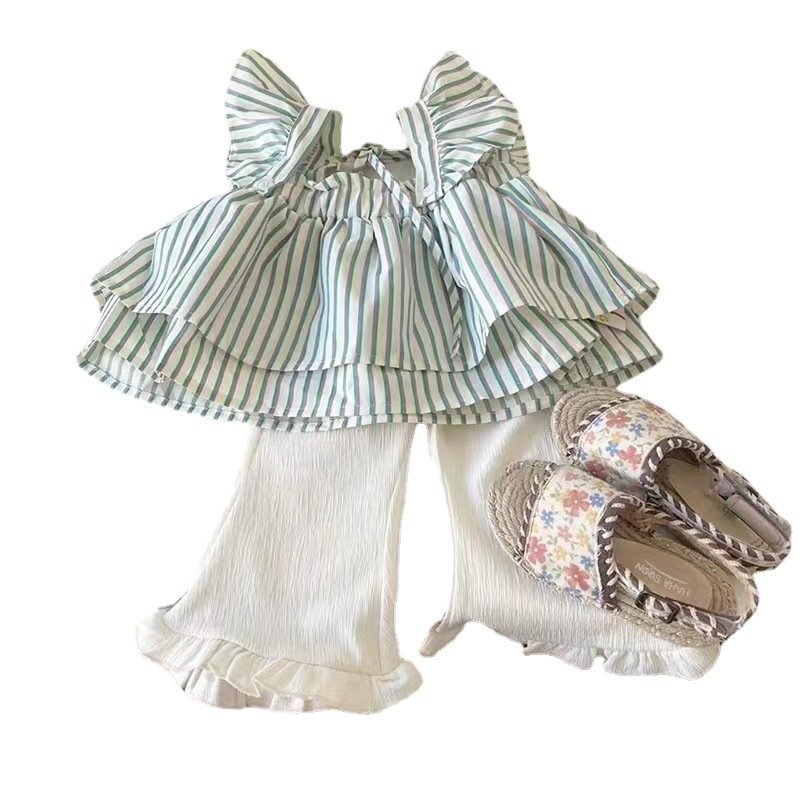 Kids Baby Girls Summer Casual Cute Stripe Print Fluttering Sleeve Top Flare Trousers Set