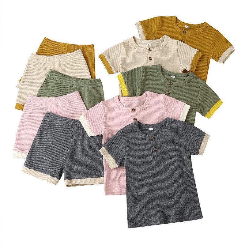 Kids Basic Color Blocking Ribbed Round Neck Short Sleeve T-Shirt And Elastic Shorts