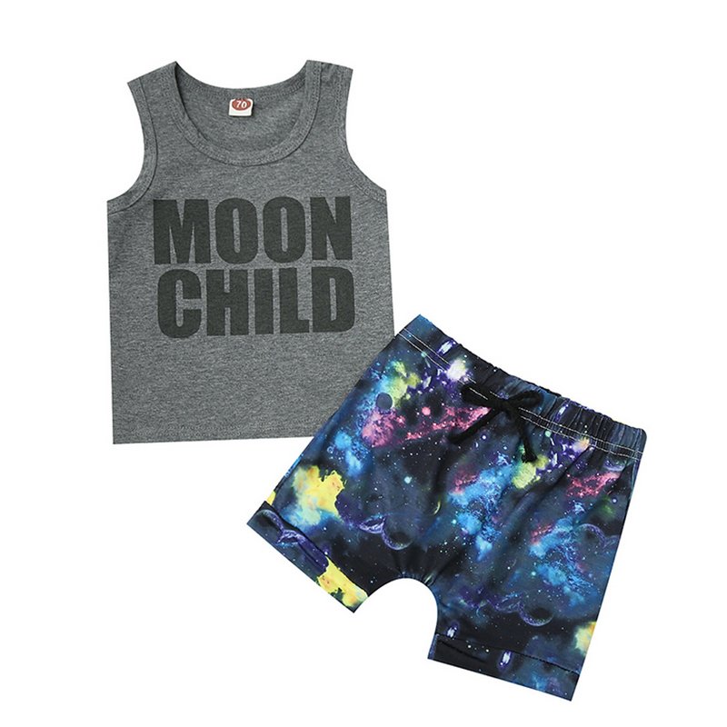 Kids Boys Basic Round Neck Short Sleeve Letter Pattern Vest And Elastic Star Pattern Casual Shorts Set