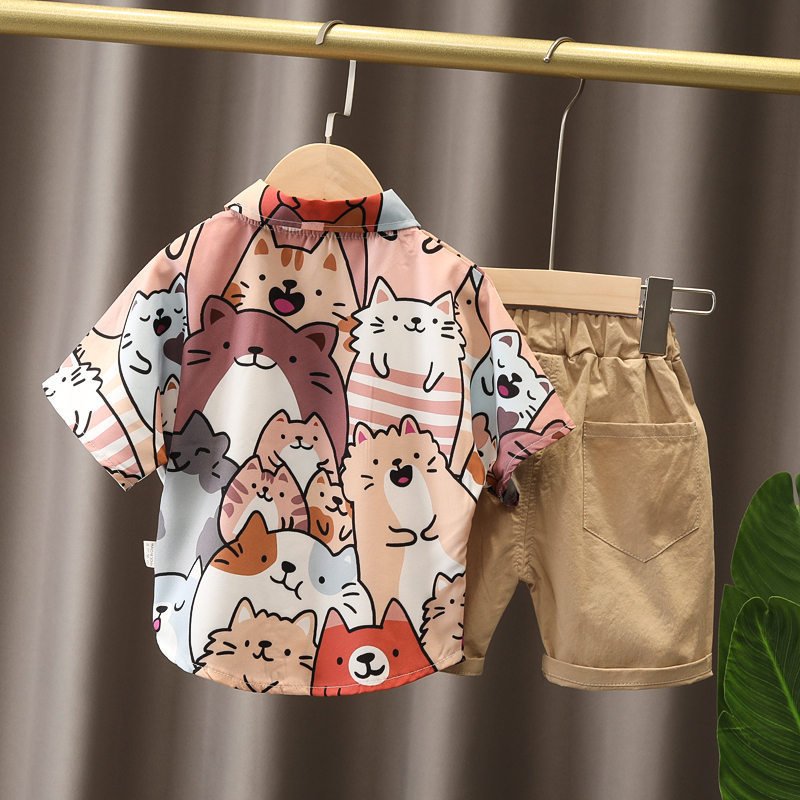 Kids Boys Casual Cartoon Cat All Over Print Lapel Short Sleeve Single-breasted Shirt And Elastic Shorts Set