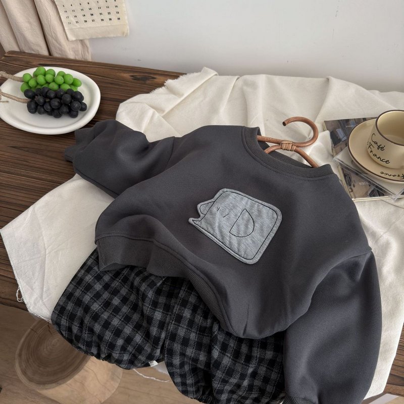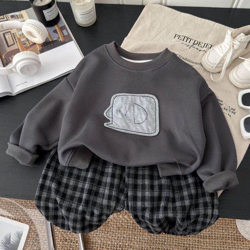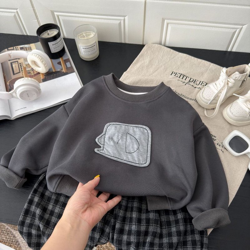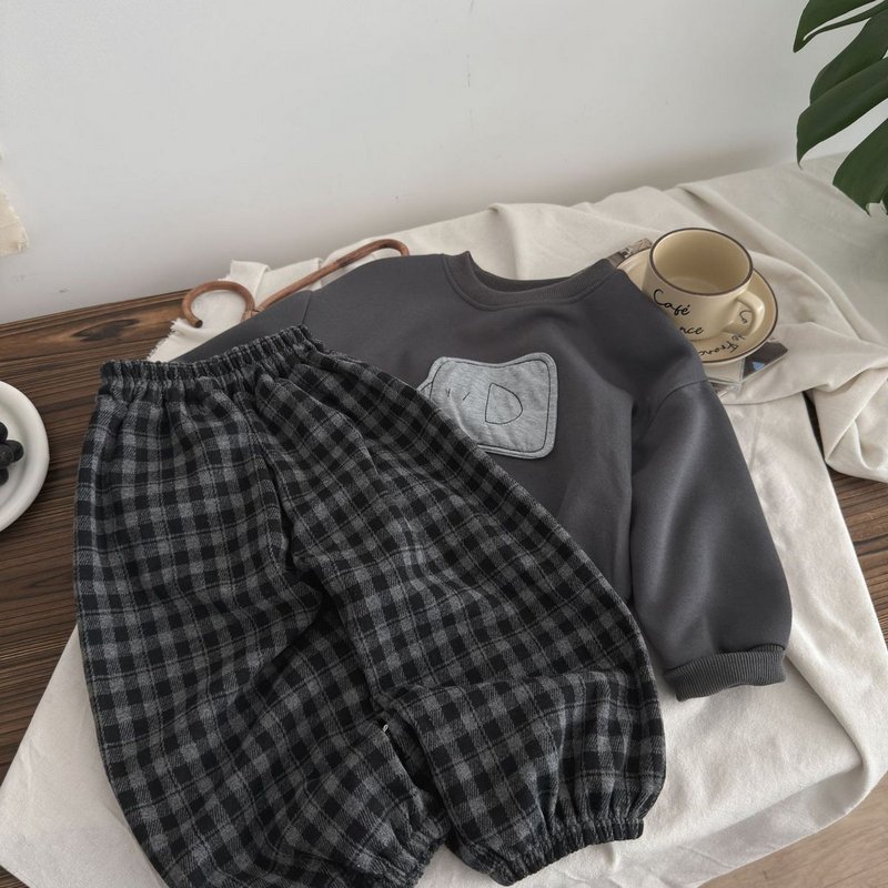 Kids Boys Fashion Casual Autumn Cartoon Elephant Long-Sleeve Sweatshirt Plaid Pants Two-Piece Set