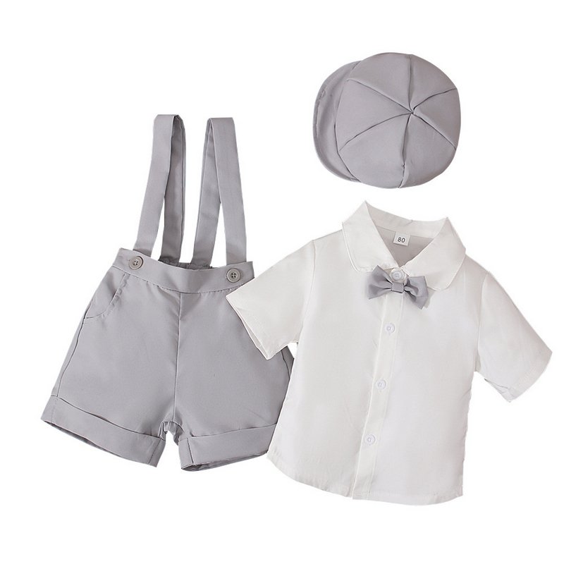 Kids Boys Summer Gentleman Suit Short-Sleeved Shirt Suspender Shorts Hat Three-Piece Set