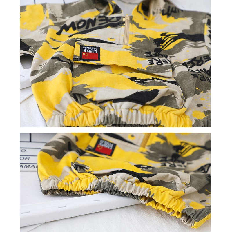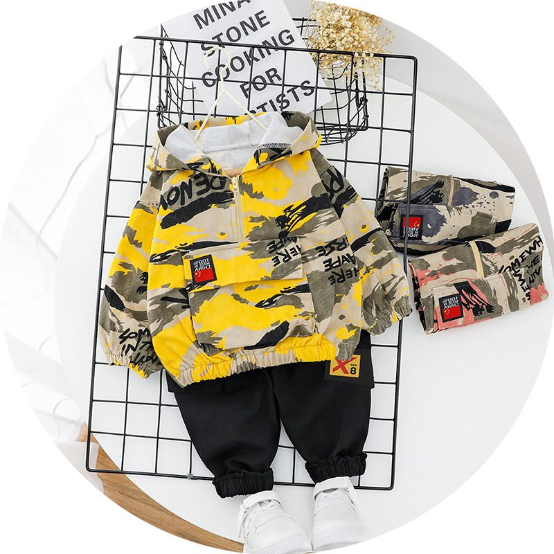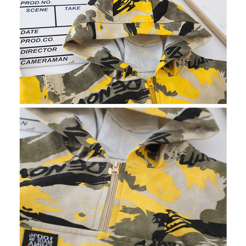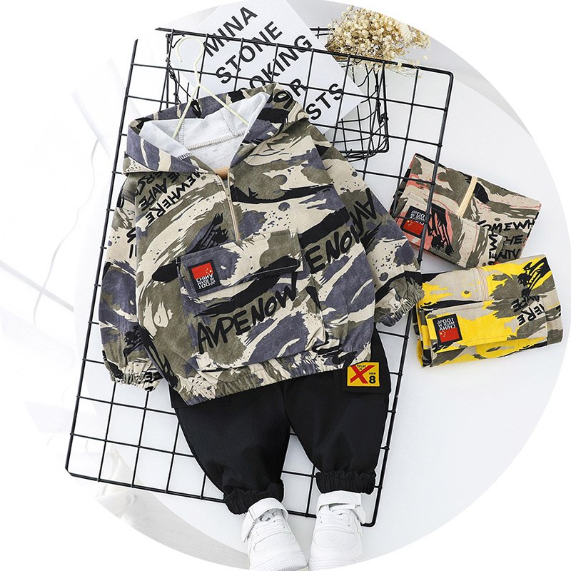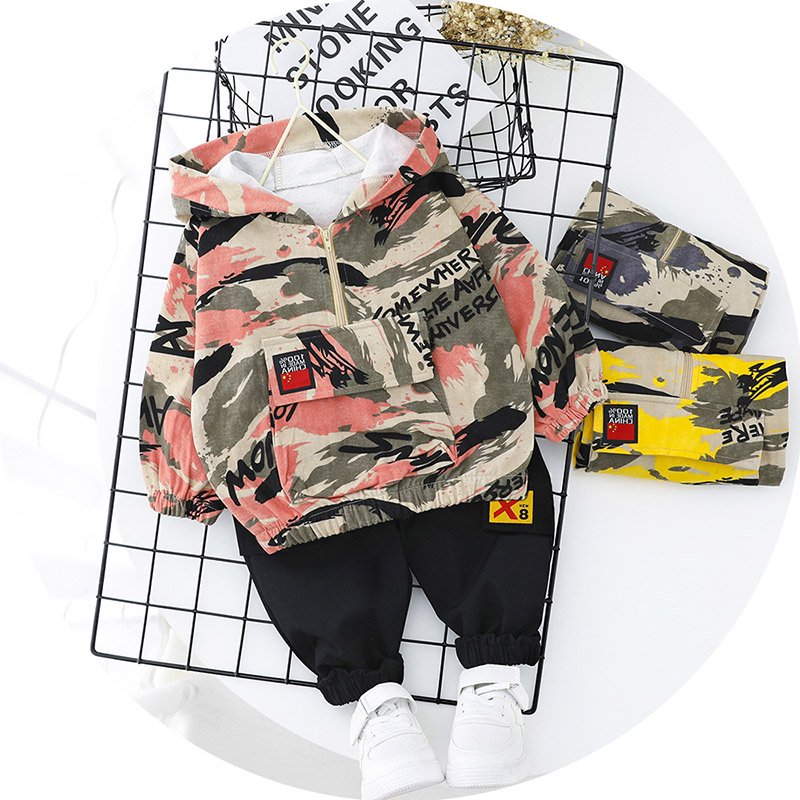 Kids Camouflage Pattern Zipper Design Hooded Tops And Solid Color Pants Set