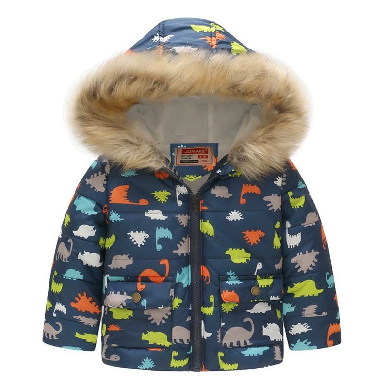 Kids Cartoon Colorful Print Fur Collar Short Hooded Winter Coat
