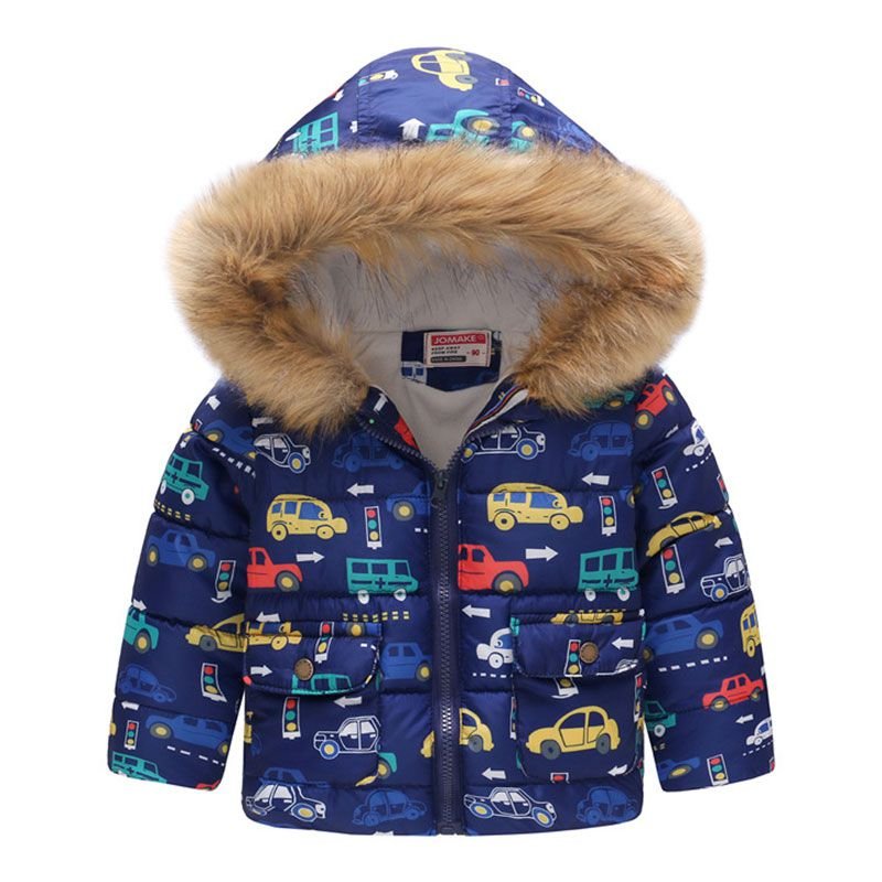 Kids Cartoon Colorful Print Fur Collar Short Hooded Winter Coat