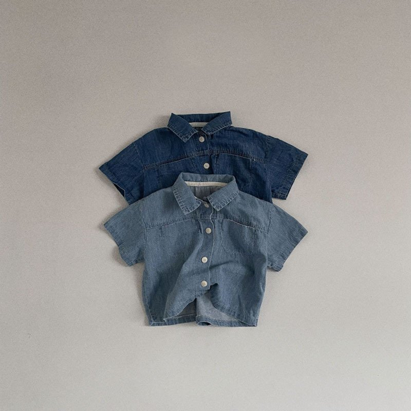 Kids Casual Lapel Solid Color Short Sleeve Single-breasted Top And Denim Elastic Waist Shorts Set